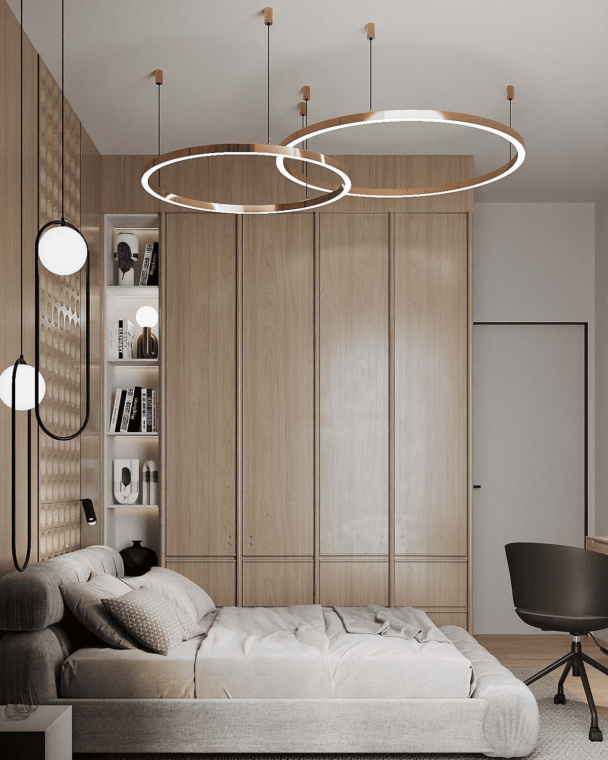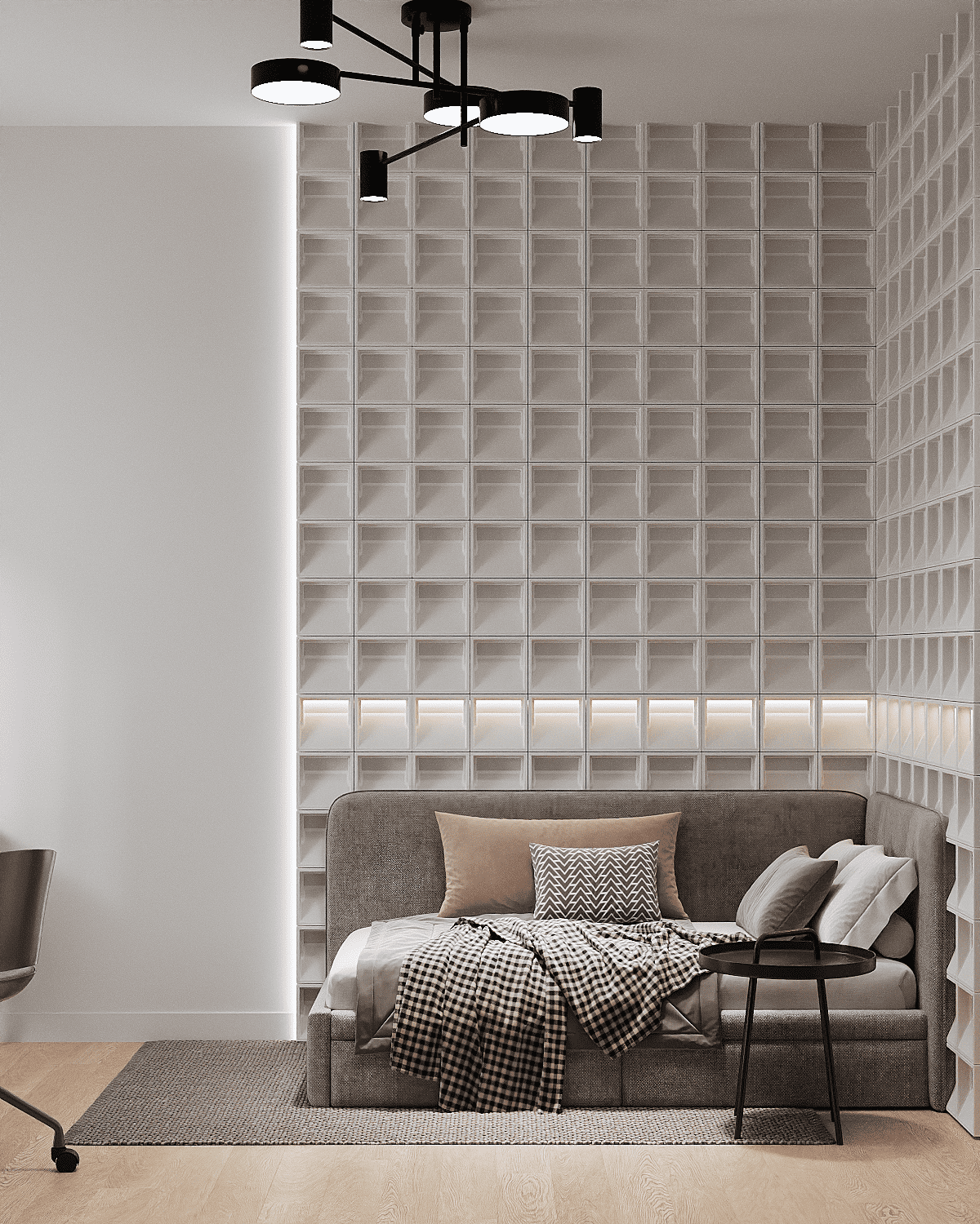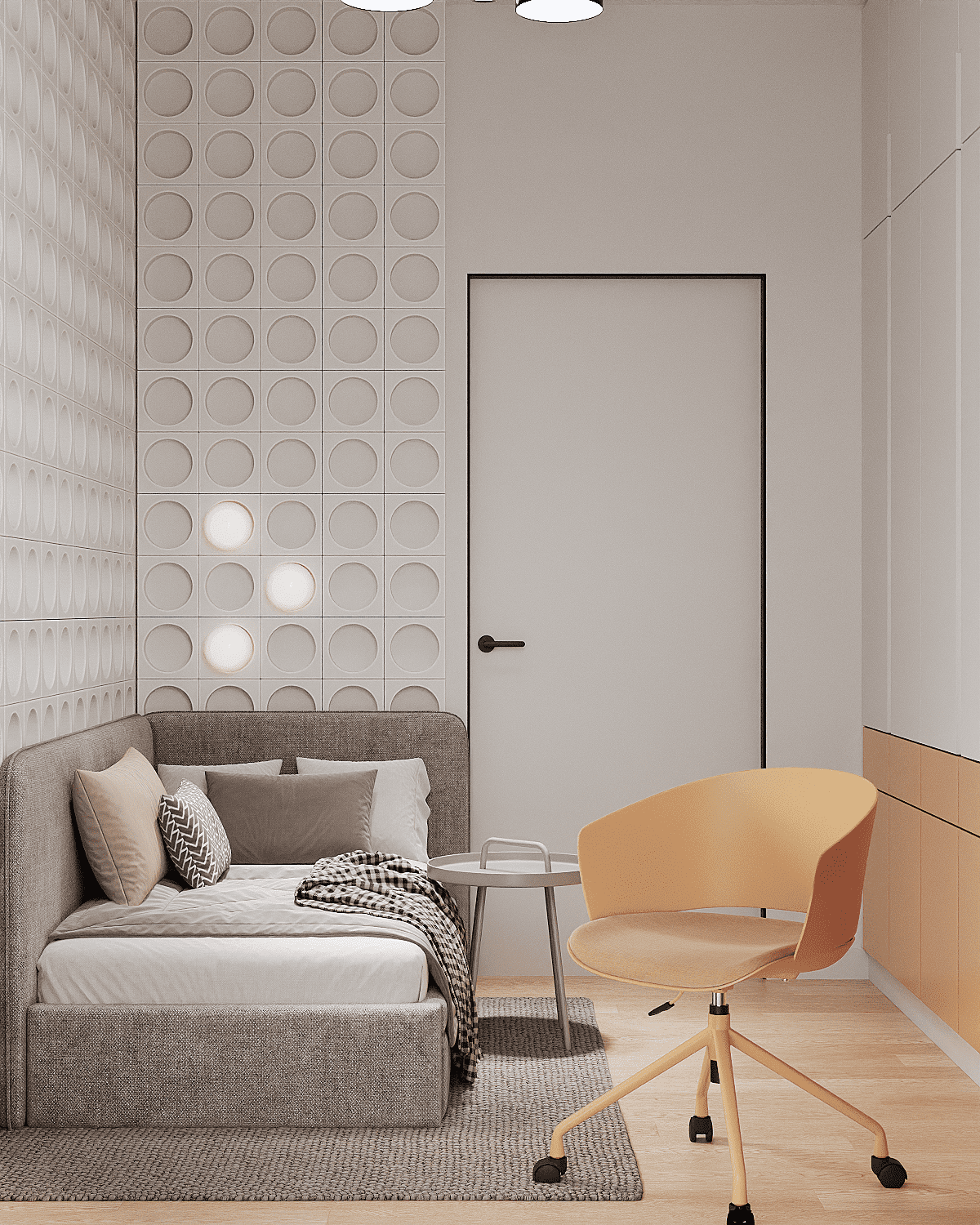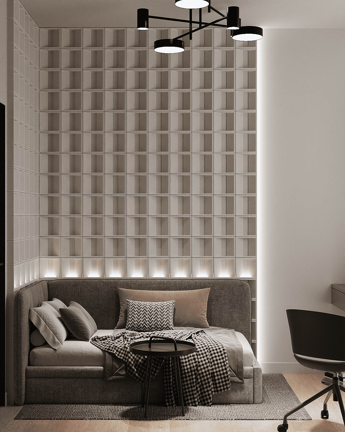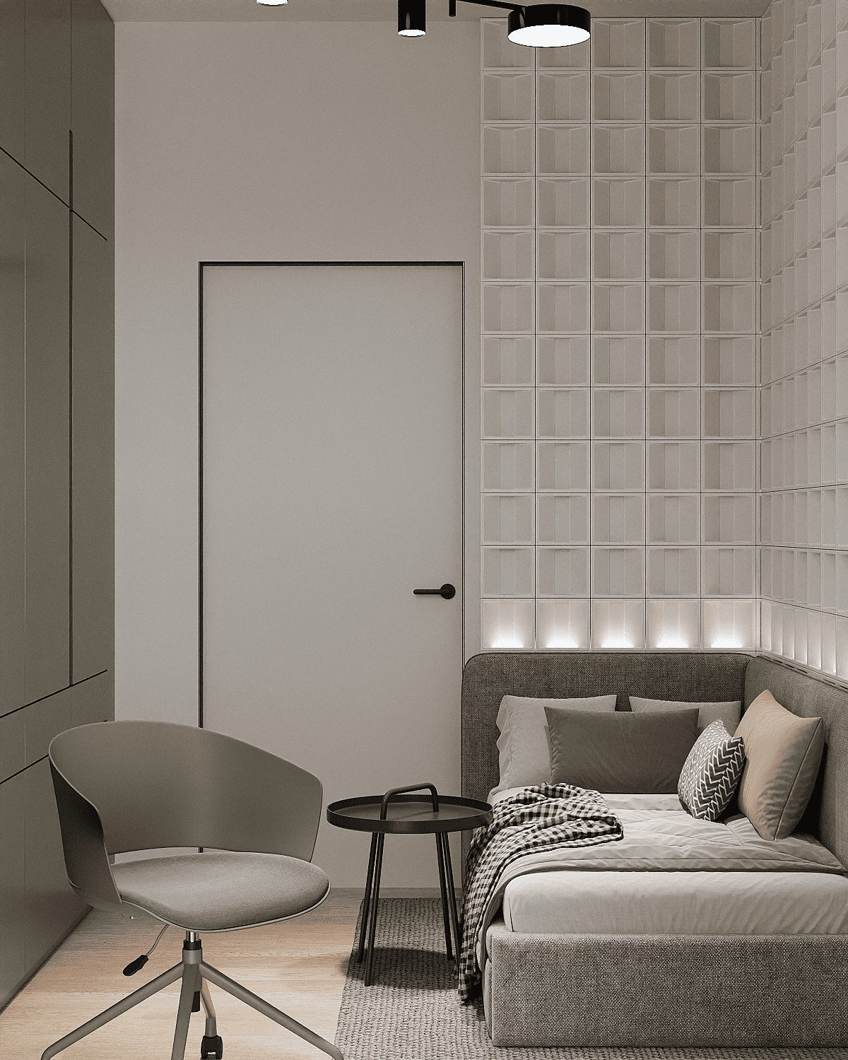 Zastosowaliśmy osłony na ścianę z geometrycznymi wzorami, które tworzą iluzję głębi i ruchu, dzięki czemu pomieszczenie wydaje się większe i bardziej dynamiczne. Poprzez odpowiednie rozmieszczenie mebli na wymiar i zaplanowanie stref (spania, pracy, przechowywania), stworzyliśmy wnętrze, które, mimo niewielkich wymiarów, jest w pełni funkcjonalne i ergonomiczne.