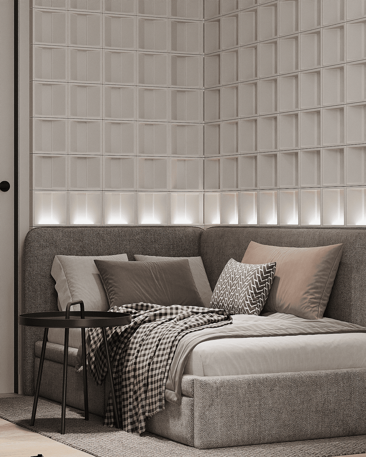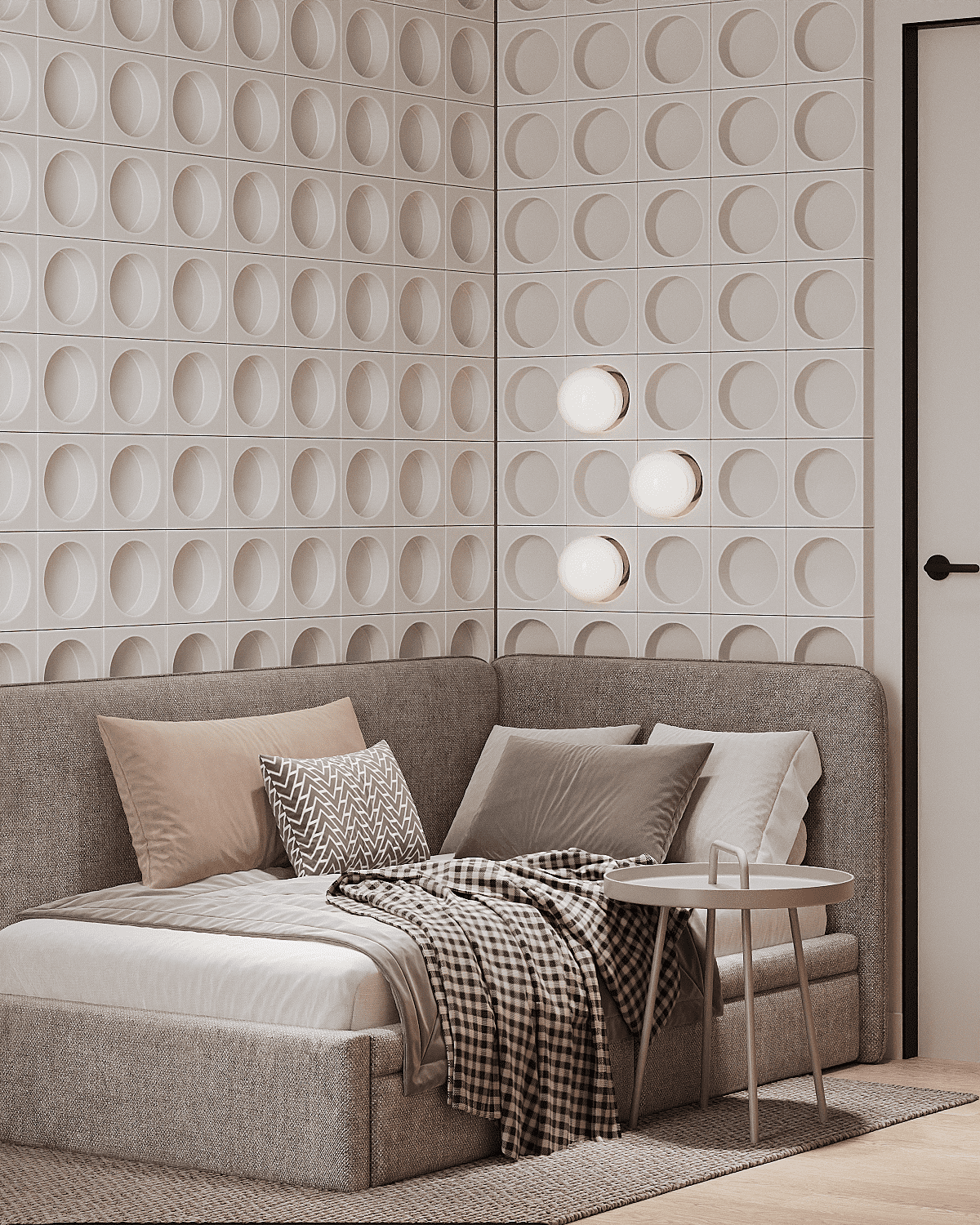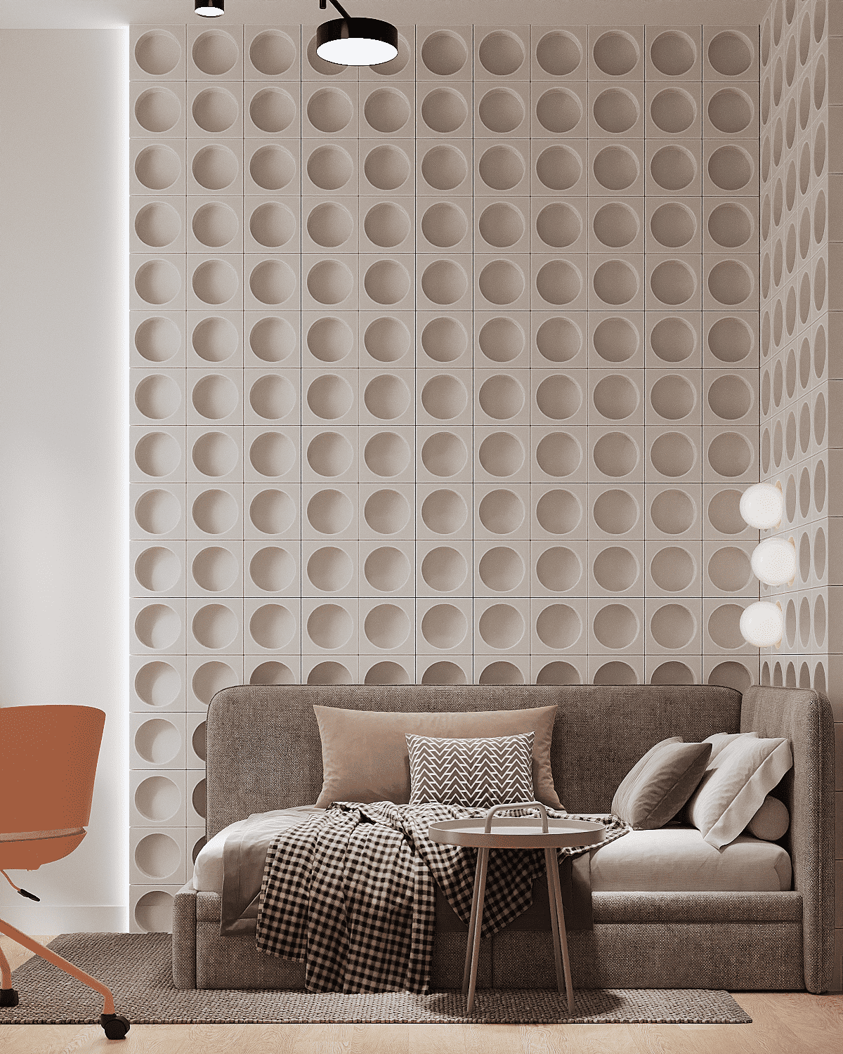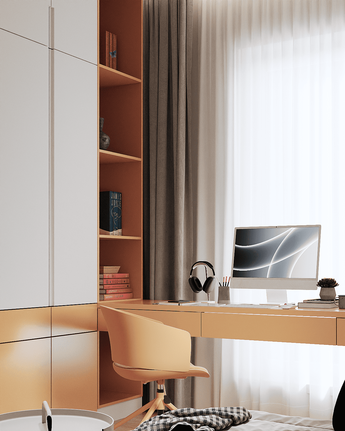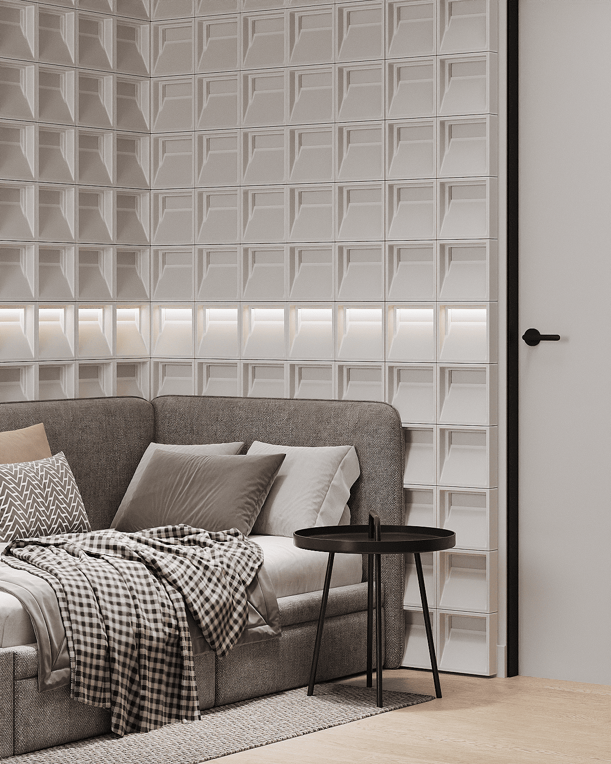 Zastosowaliśmy osłony na ścianę z geometrycznymi wzorami, które tworzą iluzję głębi i ruchu, dzięki czemu pomieszczenie wydaje się większe i bardziej dynamiczne. Poprzez odpowiednie rozmieszczenie mebli na wymiar i zaplanowanie stref (spania, pracy, przechowywania), stworzyliśmy wnętrze, które, mimo niewielkich wymiarów, jest w pełni funkcjonalne i ergonomiczne.