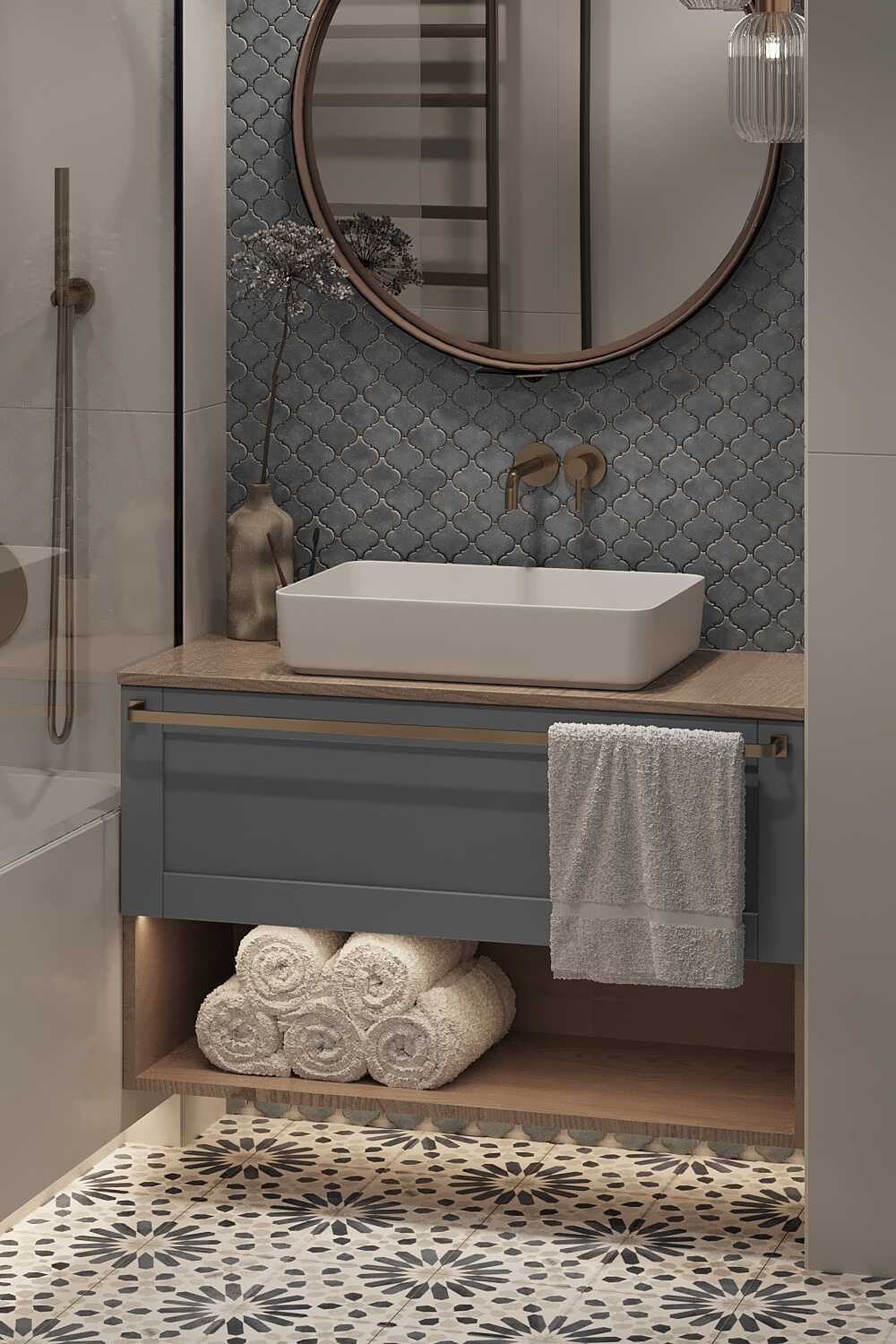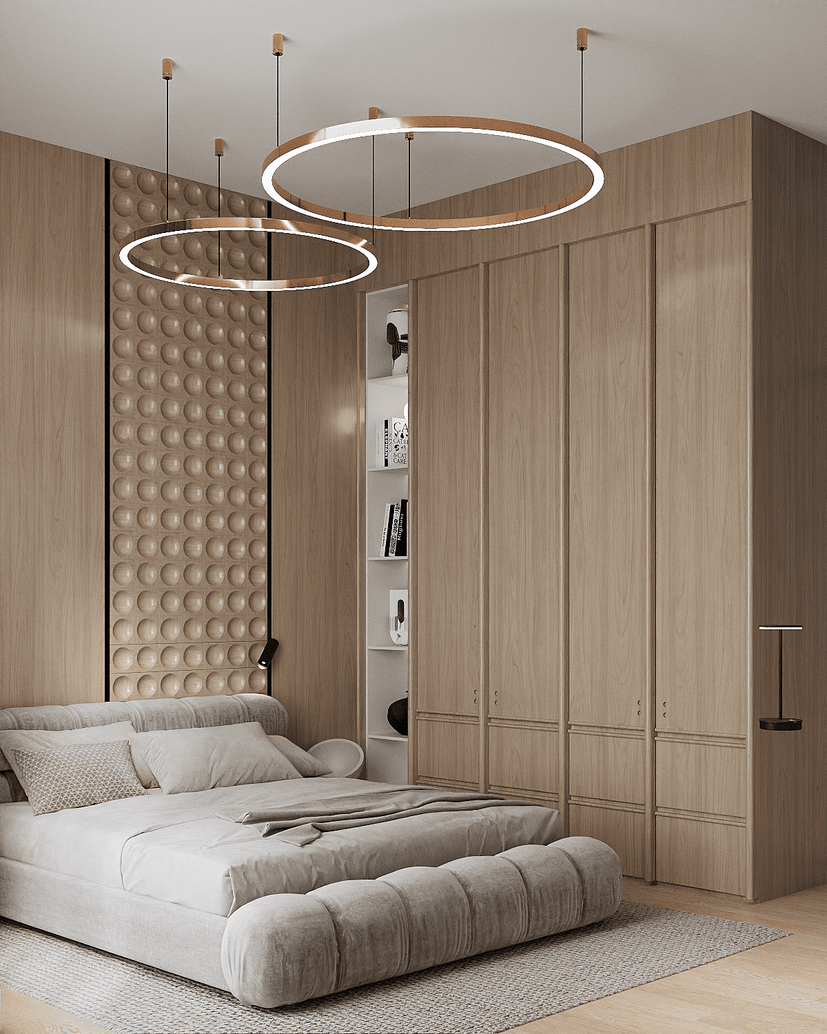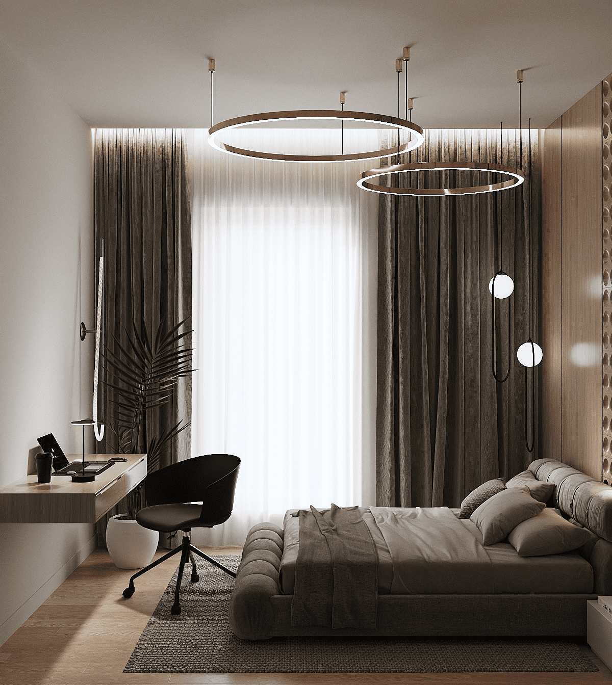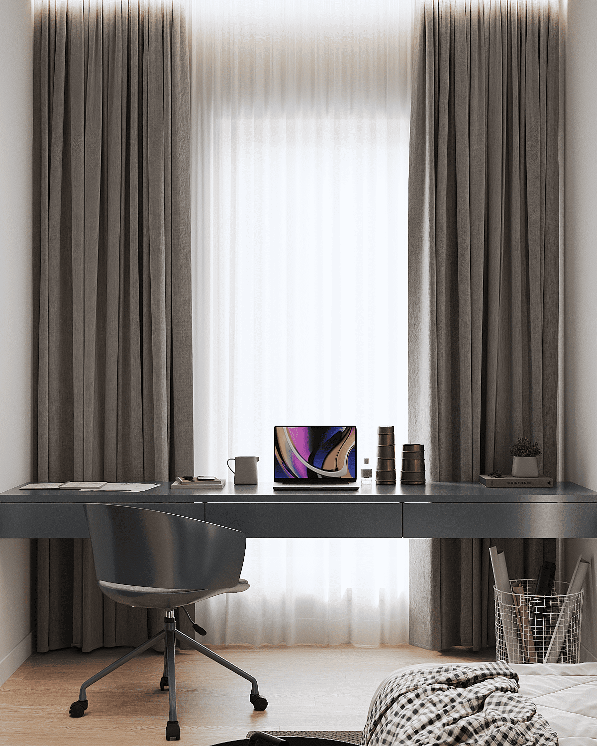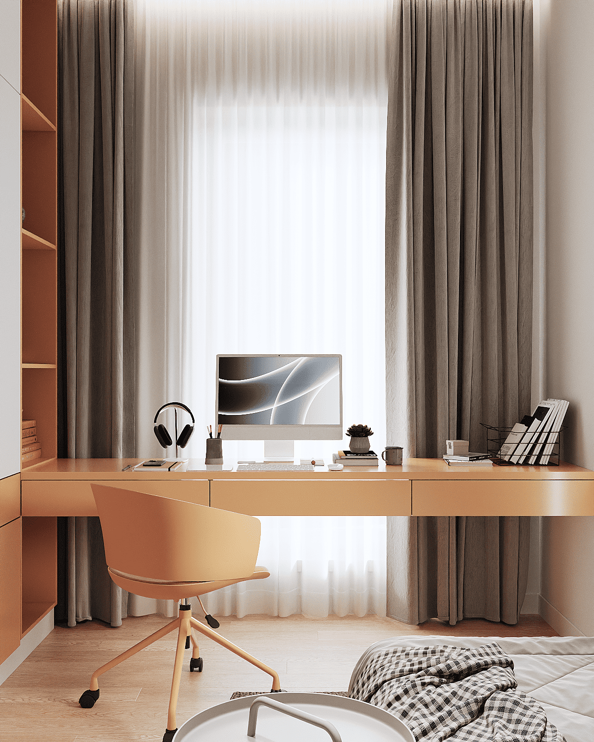 Zastosowaliśmy osłony na ścianę z geometrycznymi wzorami, które tworzą iluzję głębi i ruchu, dzięki czemu pomieszczenie wydaje się większe i bardziej dynamiczne. Poprzez odpowiednie rozmieszczenie mebli na wymiar i zaplanowanie stref (spania, pracy, przechowywania), stworzyliśmy wnętrze, które, mimo niewielkich wymiarów, jest w pełni funkcjonalne i ergonomiczne.