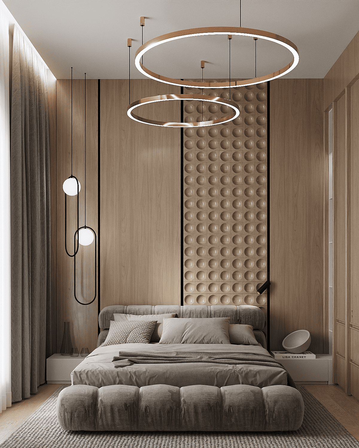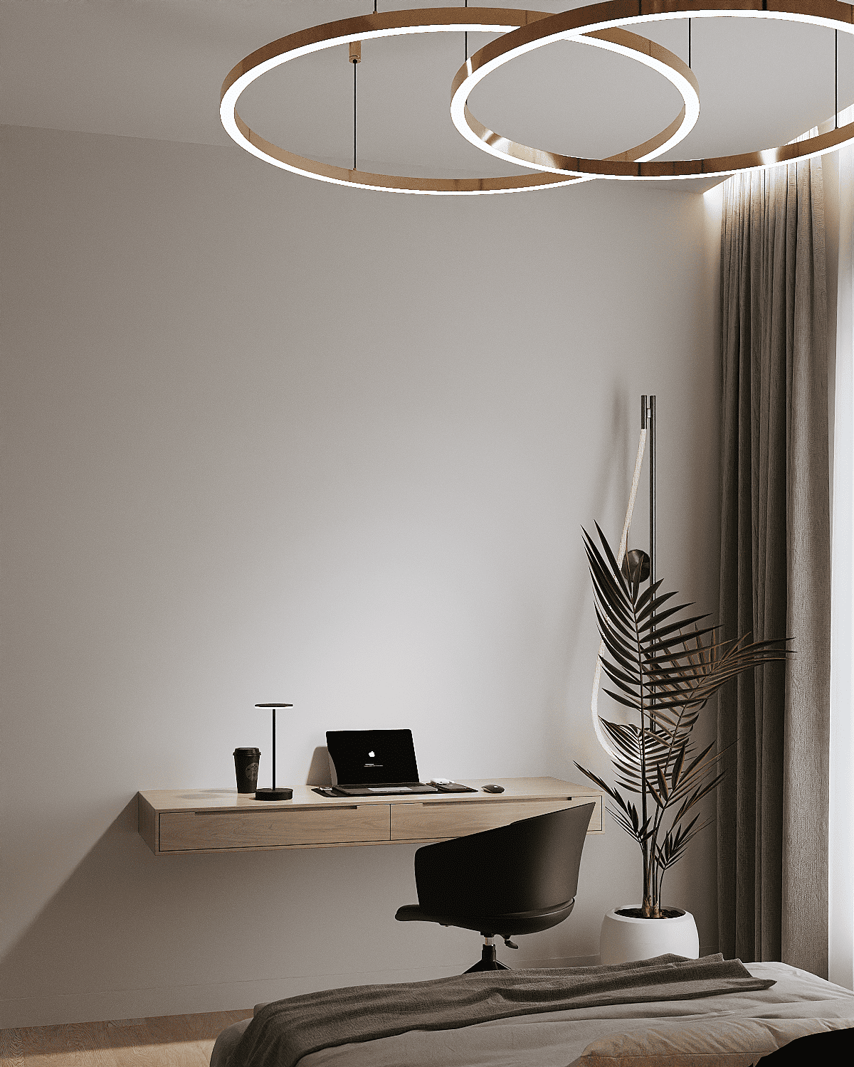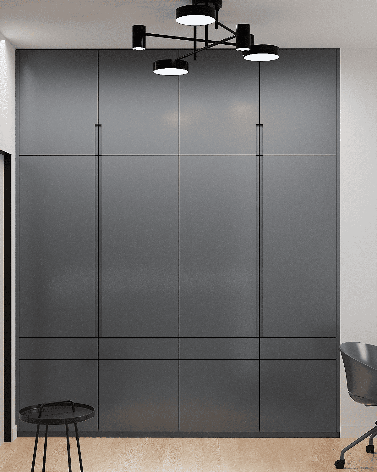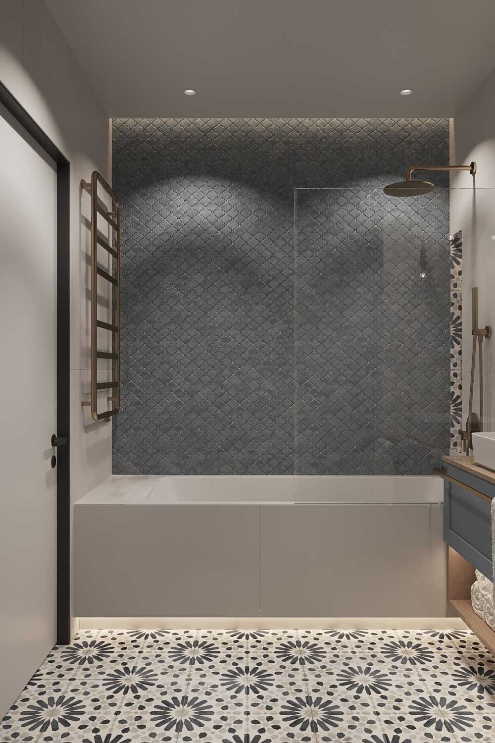 Zastosowaliśmy osłony na ścianę z geometrycznymi wzorami, które tworzą iluzję głębi i ruchu, dzięki czemu pomieszczenie wydaje się większe i bardziej dynamiczne. Poprzez odpowiednie rozmieszczenie mebli na wymiar i zaplanowanie stref (spania, pracy, przechowywania), stworzyliśmy wnętrze, które, mimo niewielkich wymiarów, jest w pełni funkcjonalne i ergonomiczne.