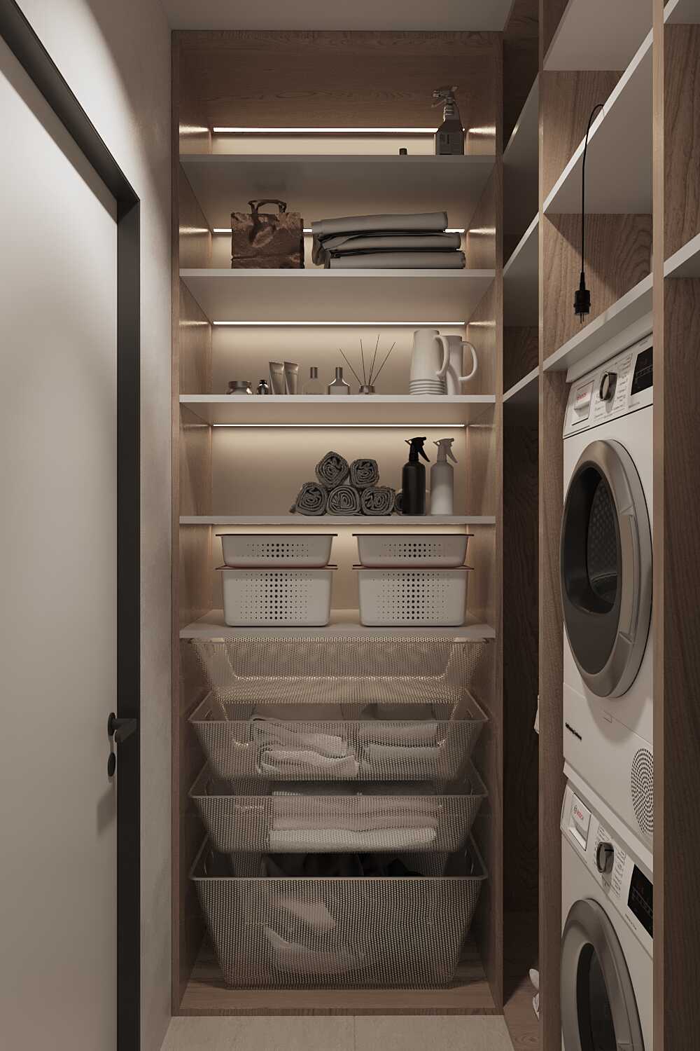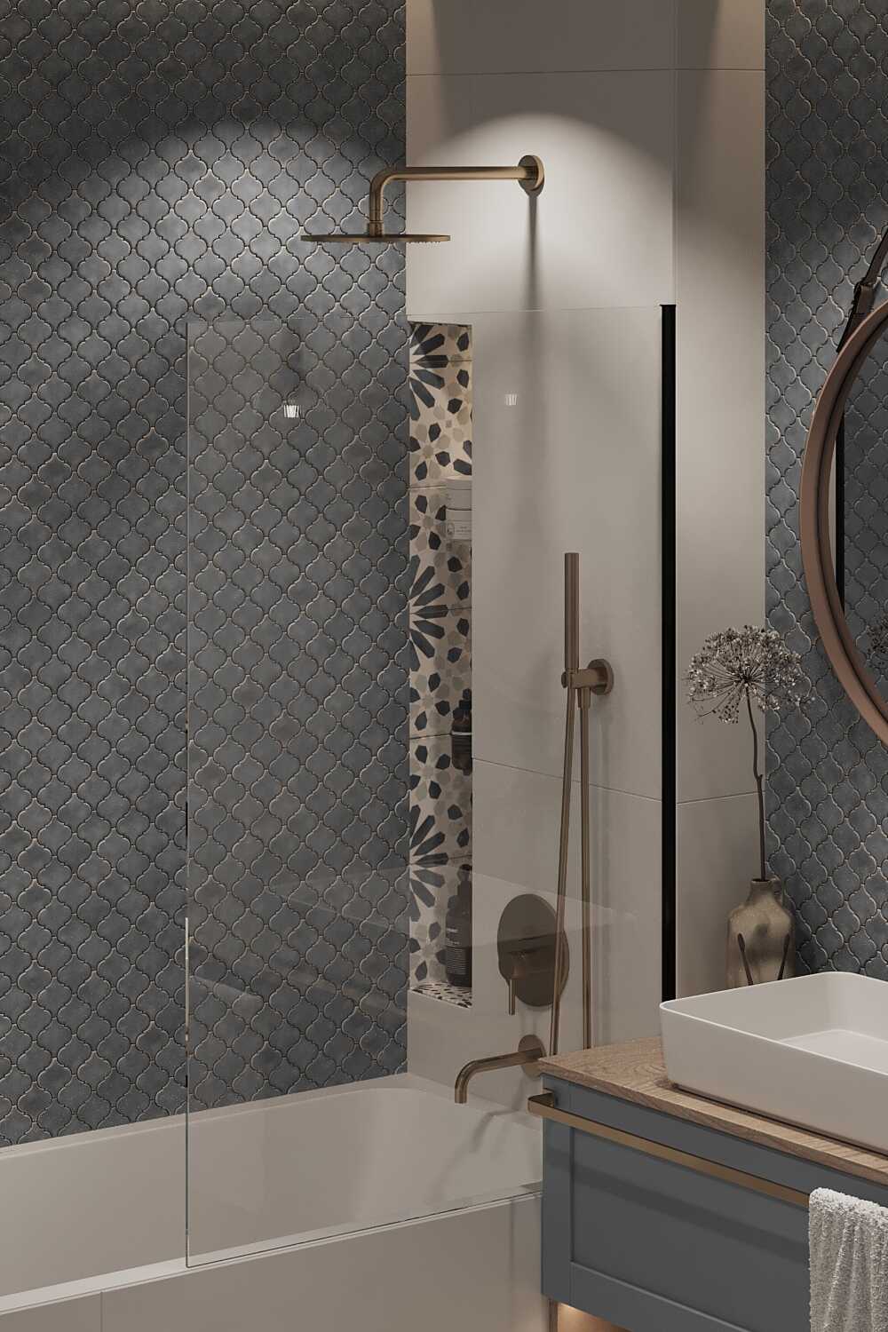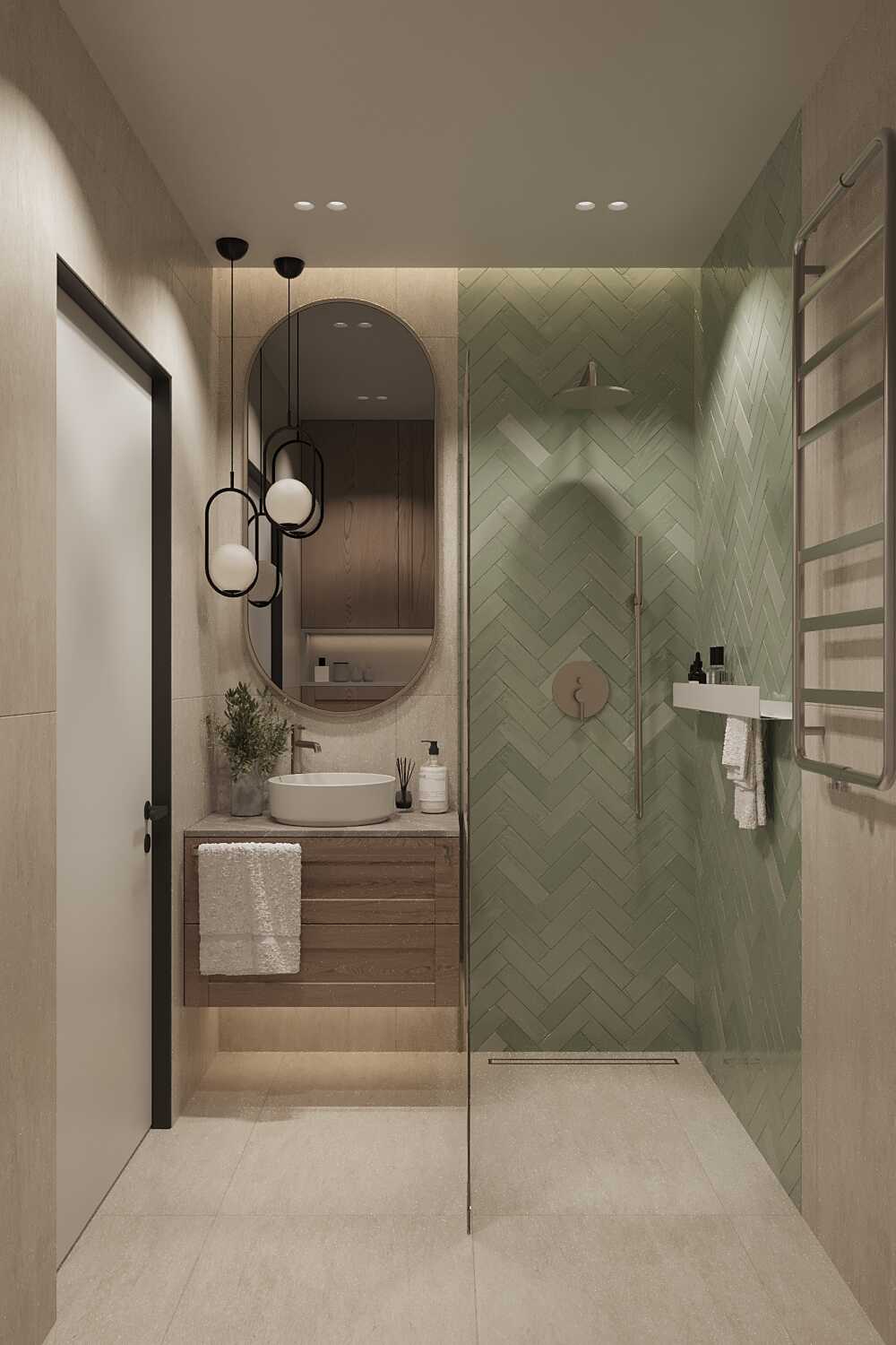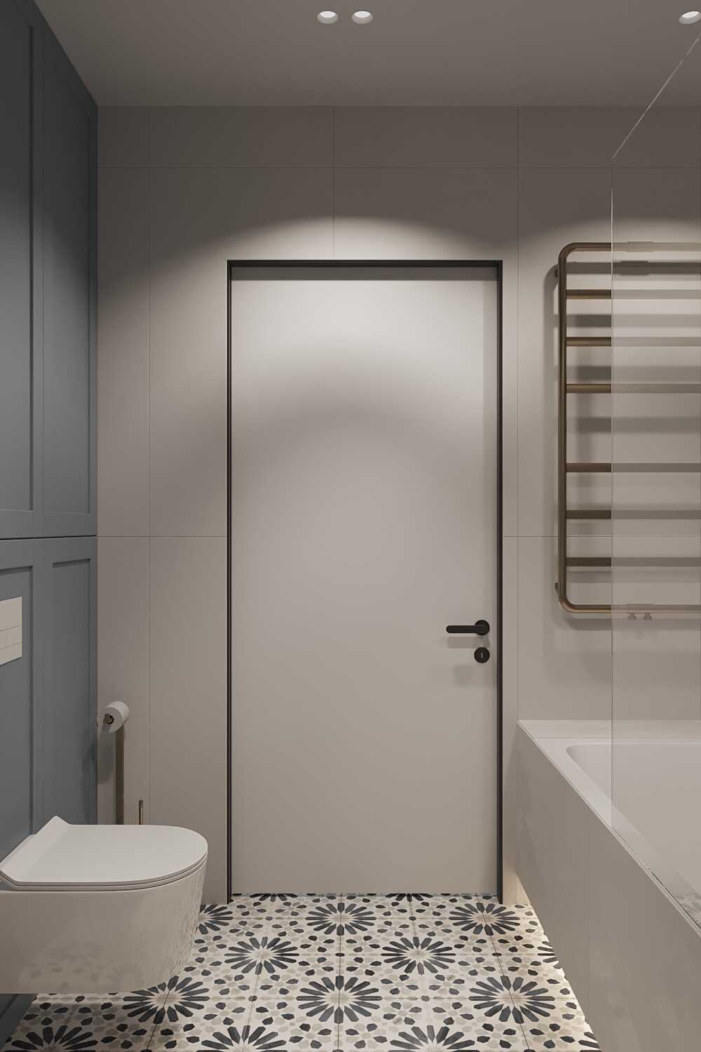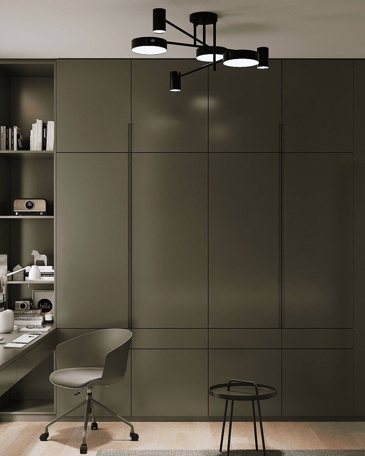 Zastosowaliśmy osłony na ścianę z geometrycznymi wzorami, które tworzą iluzję głębi i ruchu, dzięki czemu pomieszczenie wydaje się większe i bardziej dynamiczne. Poprzez odpowiednie rozmieszczenie mebli na wymiar i zaplanowanie stref (spania, pracy, przechowywania), stworzyliśmy wnętrze, które, mimo niewielkich wymiarów, jest w pełni funkcjonalne i ergonomiczne.