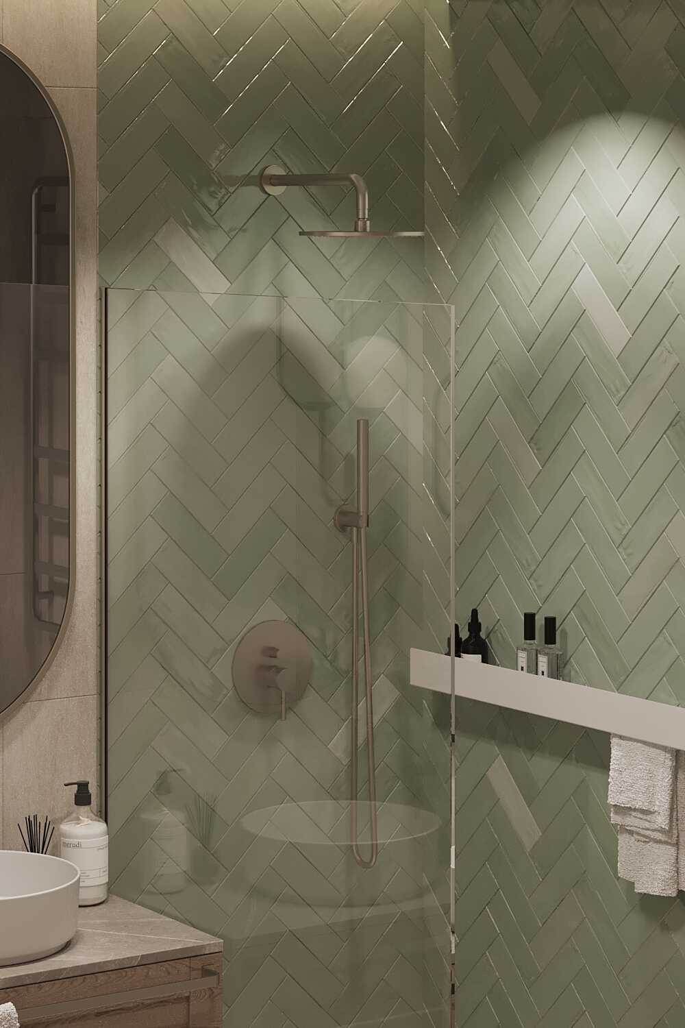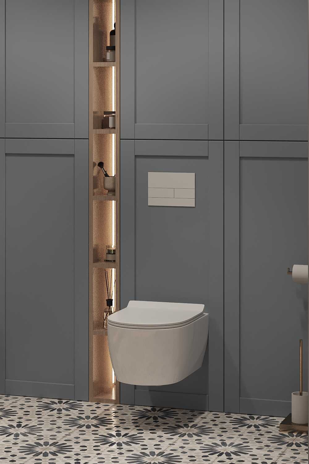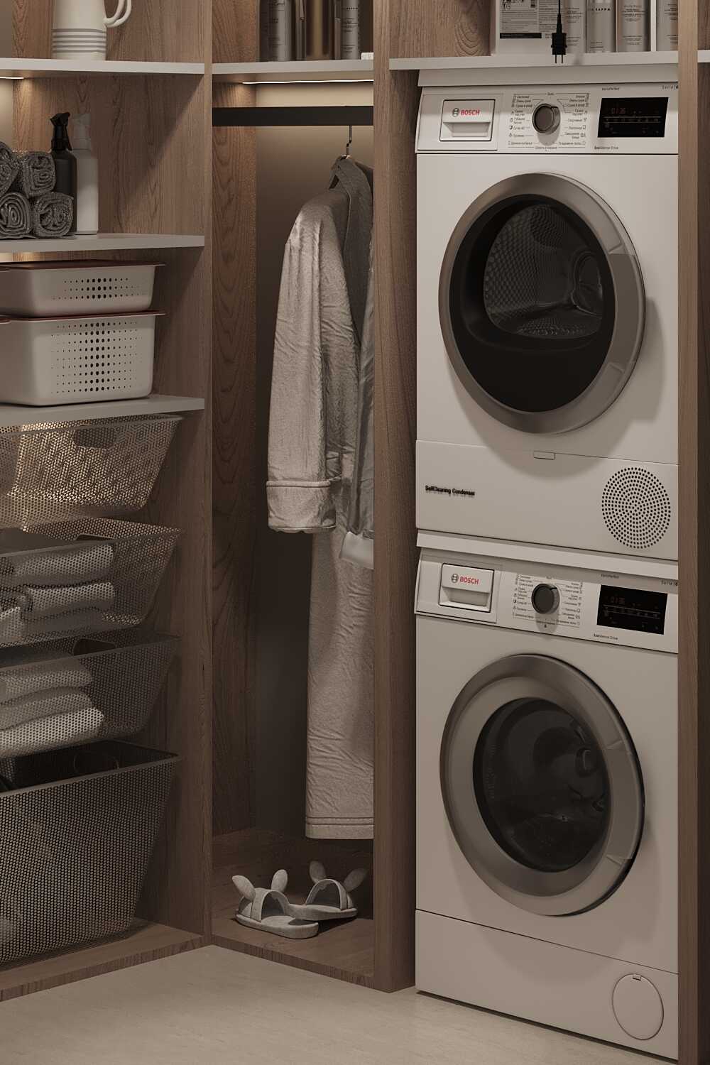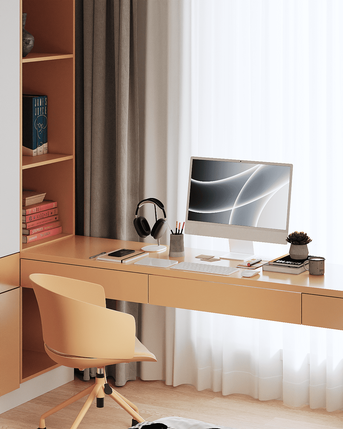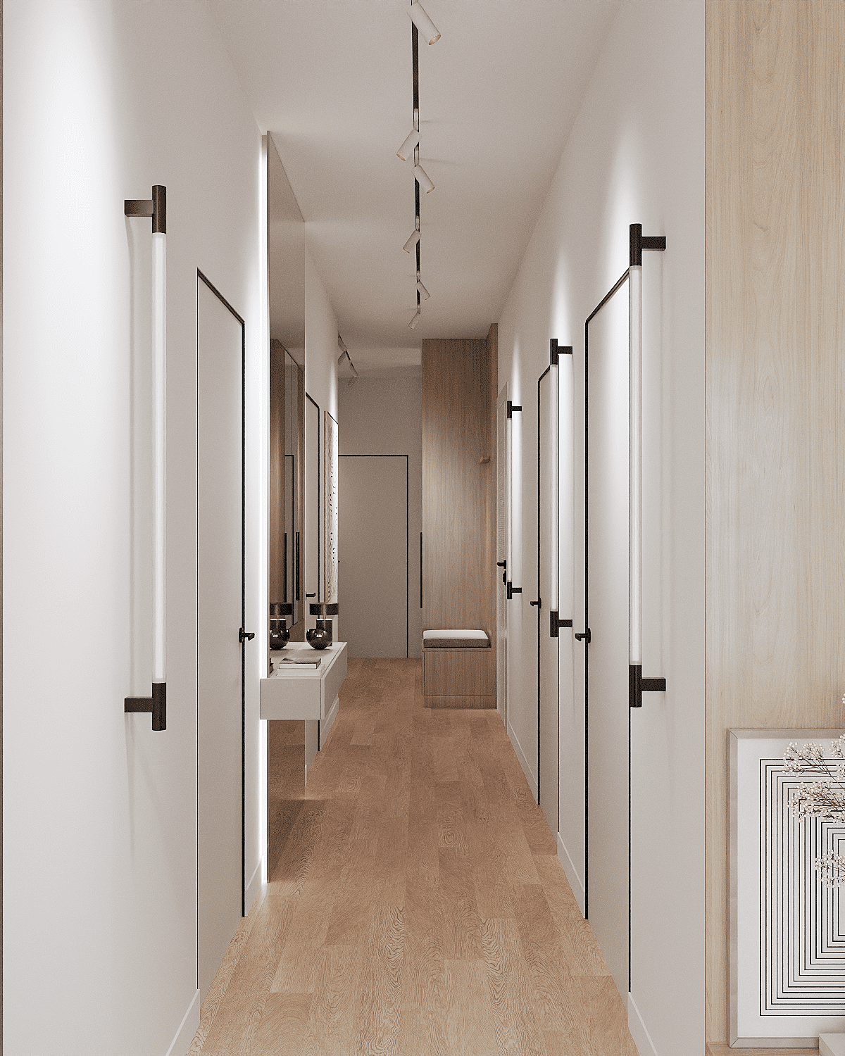 Zastosowaliśmy osłony na ścianę z geometrycznymi wzorami, które tworzą iluzję głębi i ruchu, dzięki czemu pomieszczenie wydaje się większe i bardziej dynamiczne. Poprzez odpowiednie rozmieszczenie mebli na wymiar i zaplanowanie stref (spania, pracy, przechowywania), stworzyliśmy wnętrze, które, mimo niewielkich wymiarów, jest w pełni funkcjonalne i ergonomiczne.