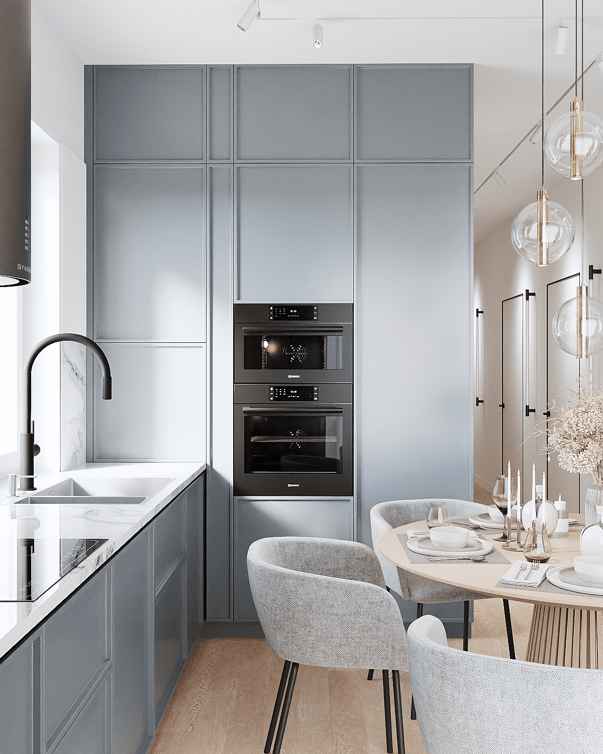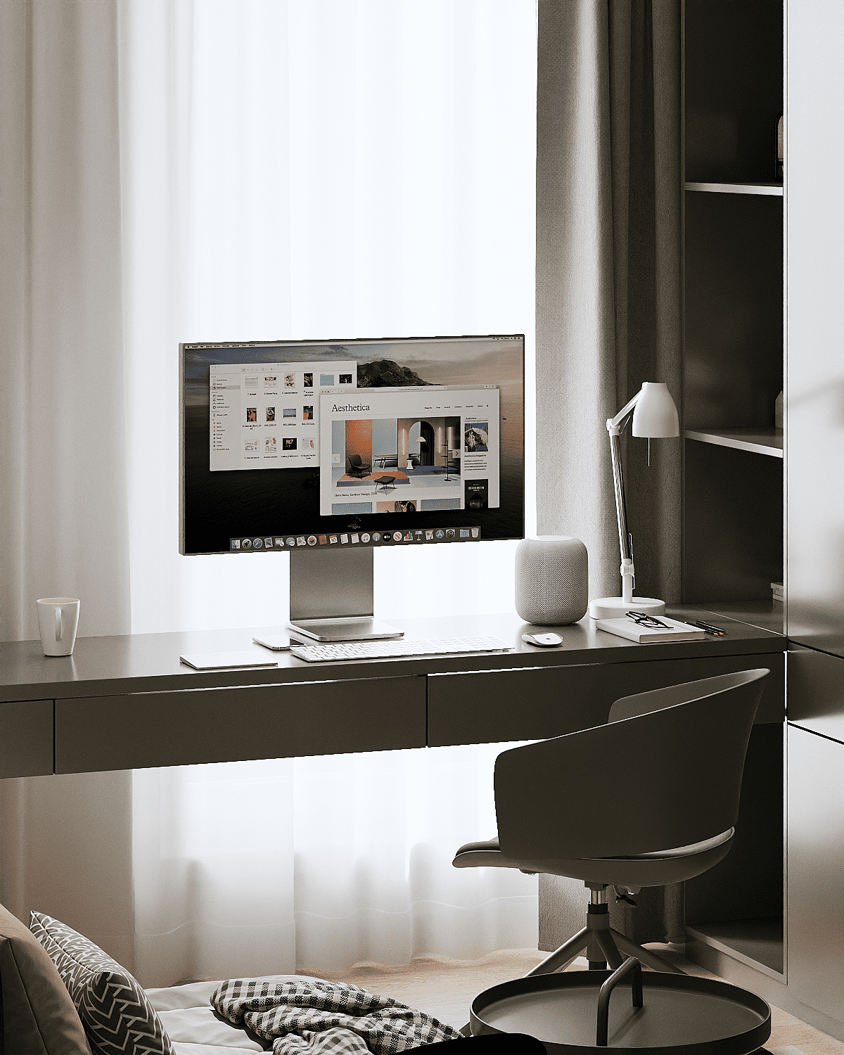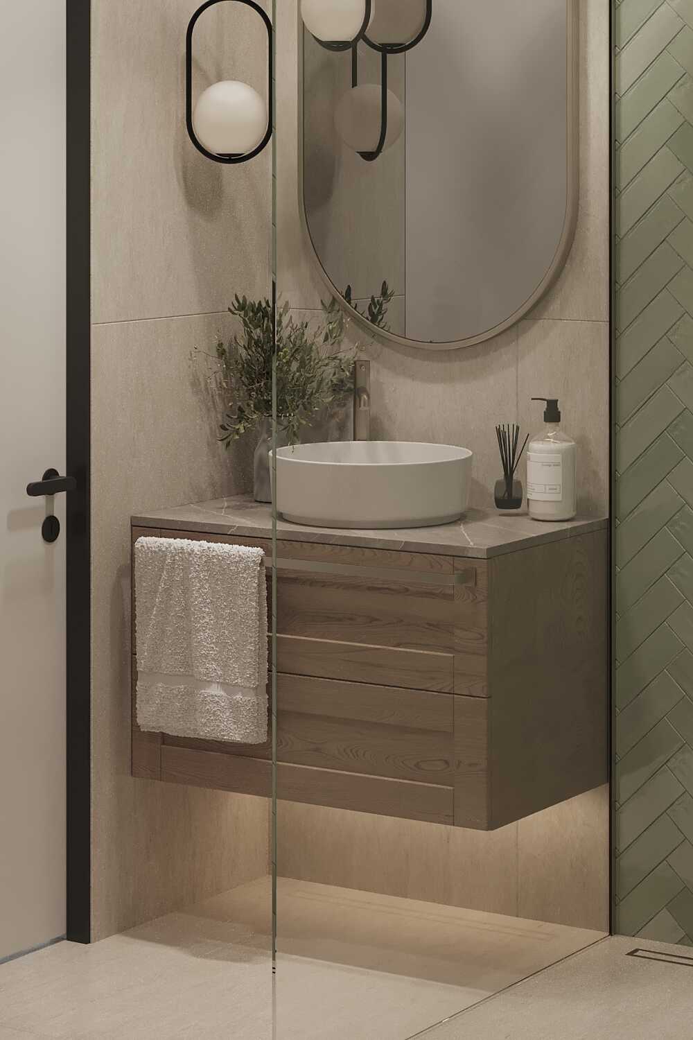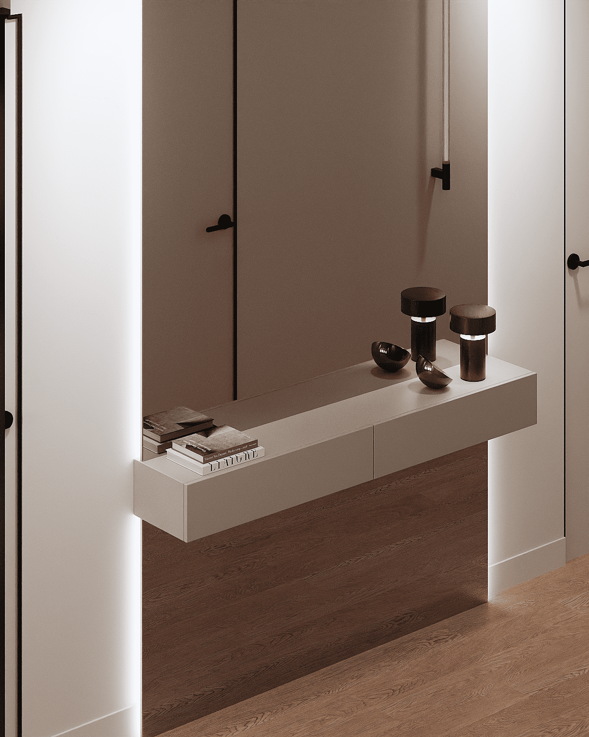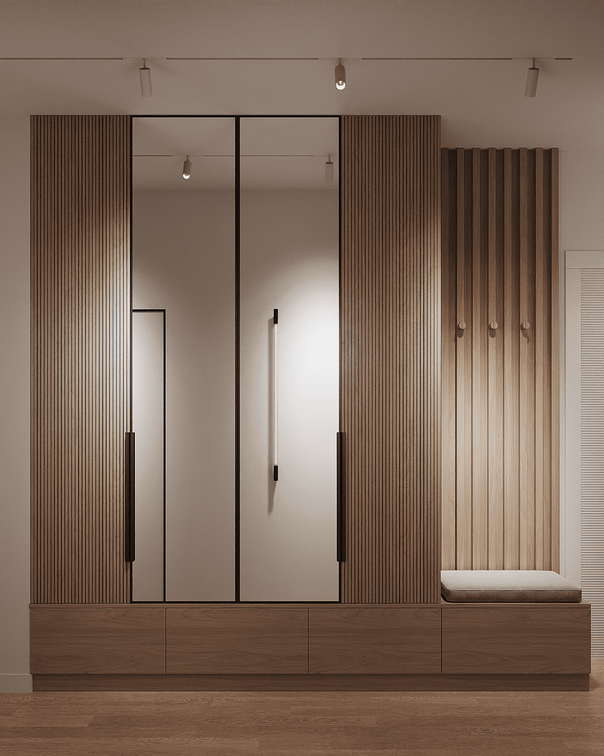 Zastosowaliśmy osłony na ścianę z geometrycznymi wzorami, które tworzą iluzję głębi i ruchu, dzięki czemu pomieszczenie wydaje się większe i bardziej dynamiczne. Poprzez odpowiednie rozmieszczenie mebli na wymiar i zaplanowanie stref (spania, pracy, przechowywania), stworzyliśmy wnętrze, które, mimo niewielkich wymiarów, jest w pełni funkcjonalne i ergonomiczne.