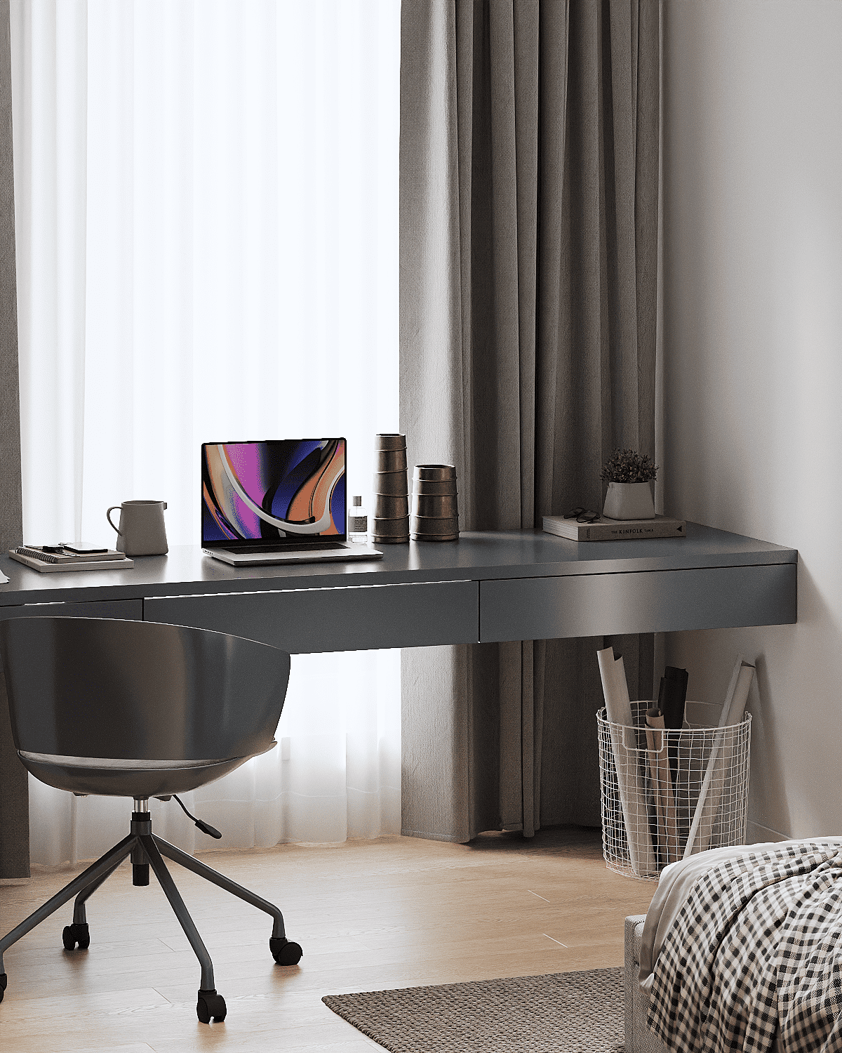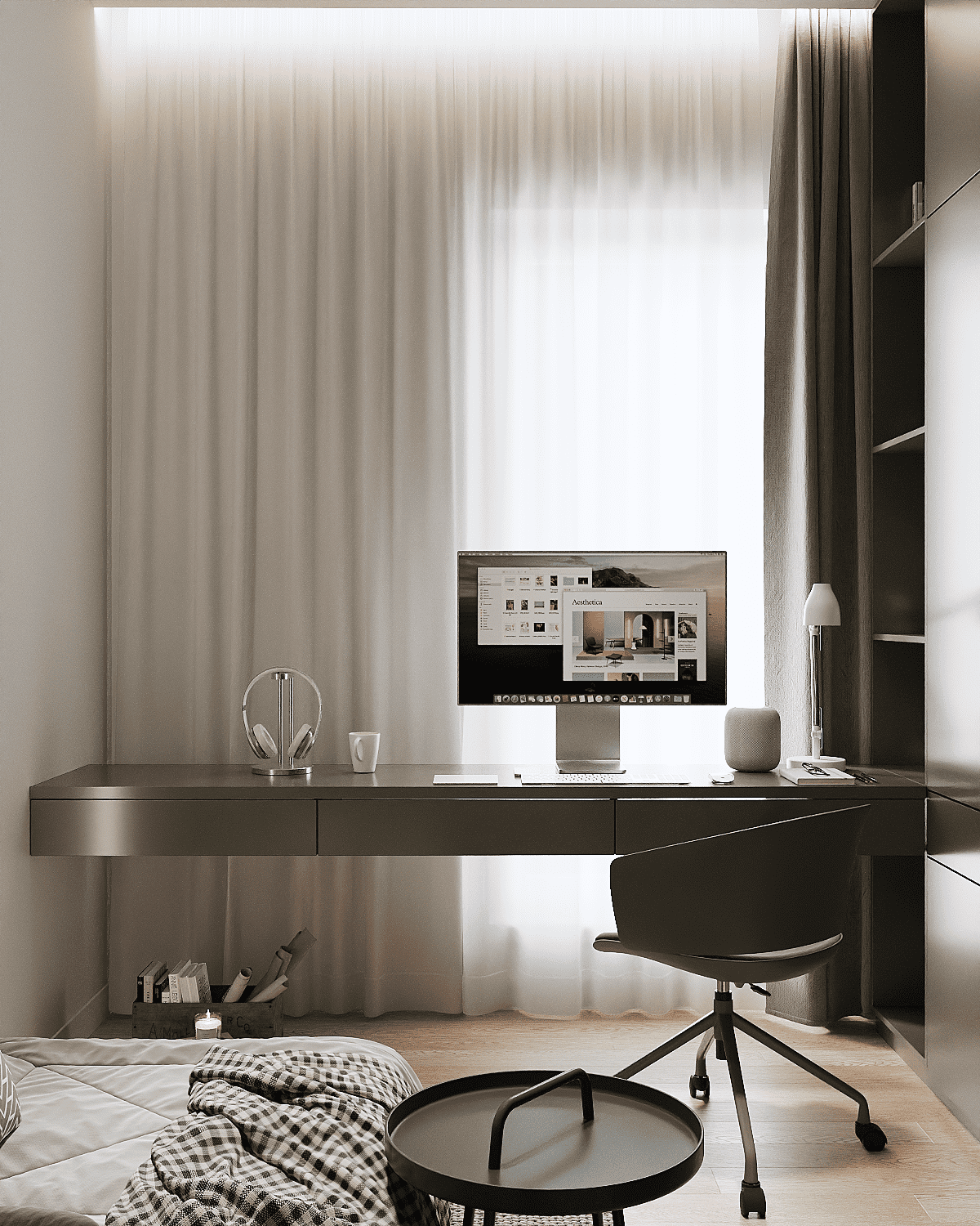 Aranżacja niewielkiej, wielofunkcyjnej sypialni.