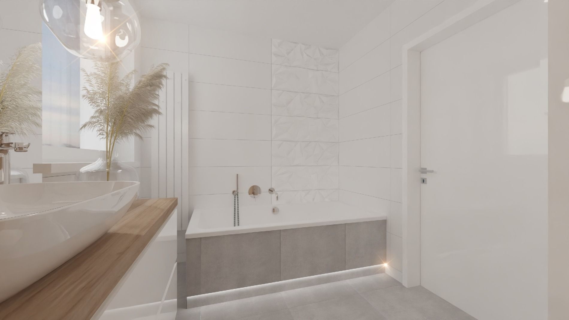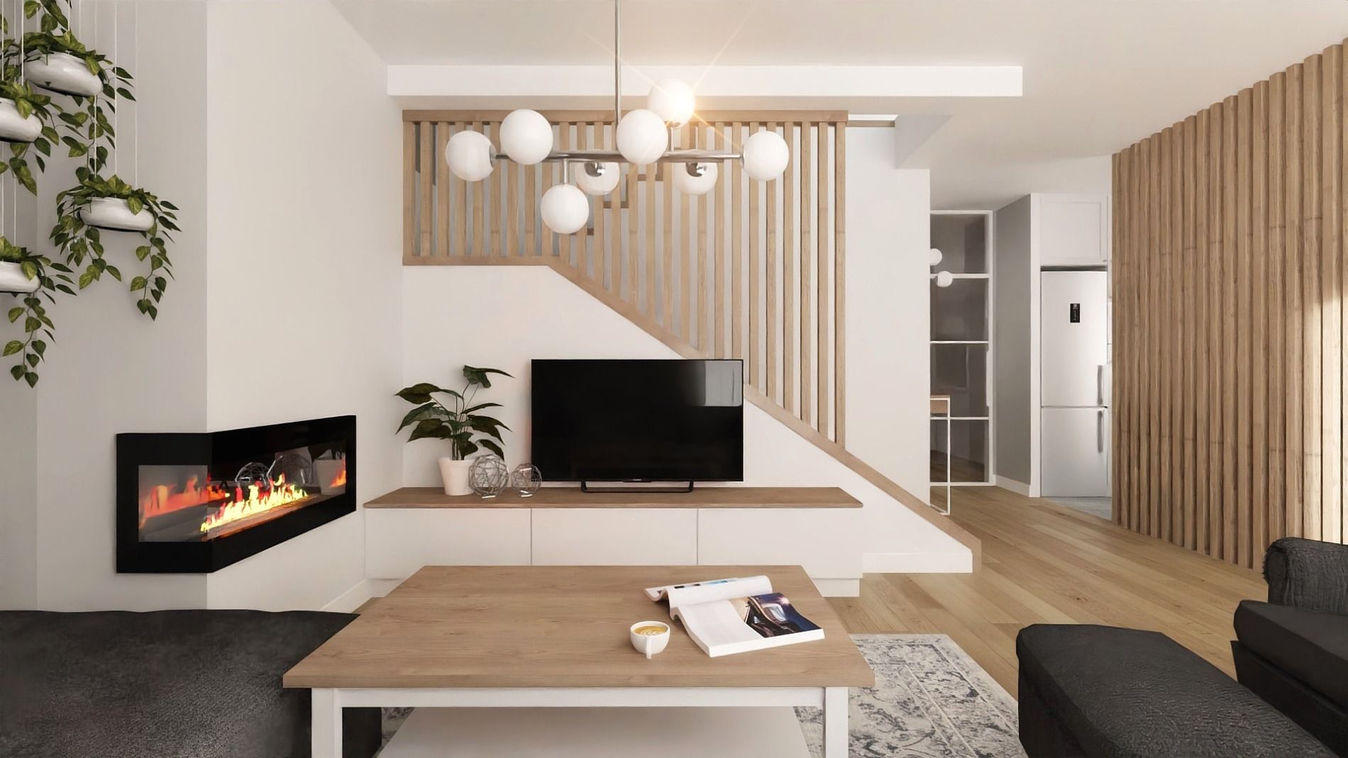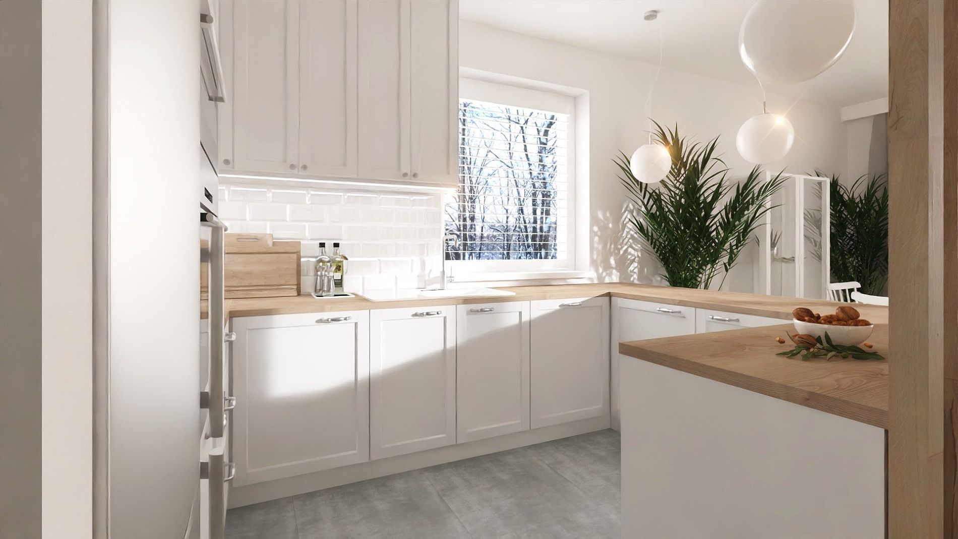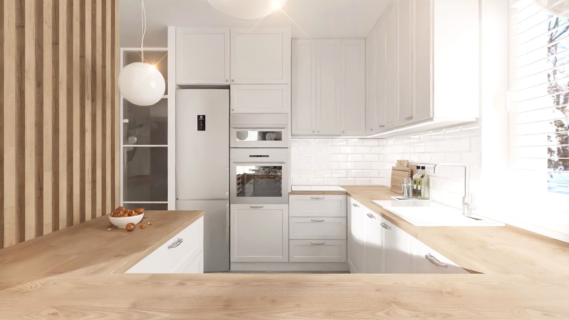Zaprojektowaliśmy efektowne lamele wydzielające przestrzeń kuchni od ciągu komunikacyjnego. W ten sposób oddzieliliśmy także kuchnię od salonu.