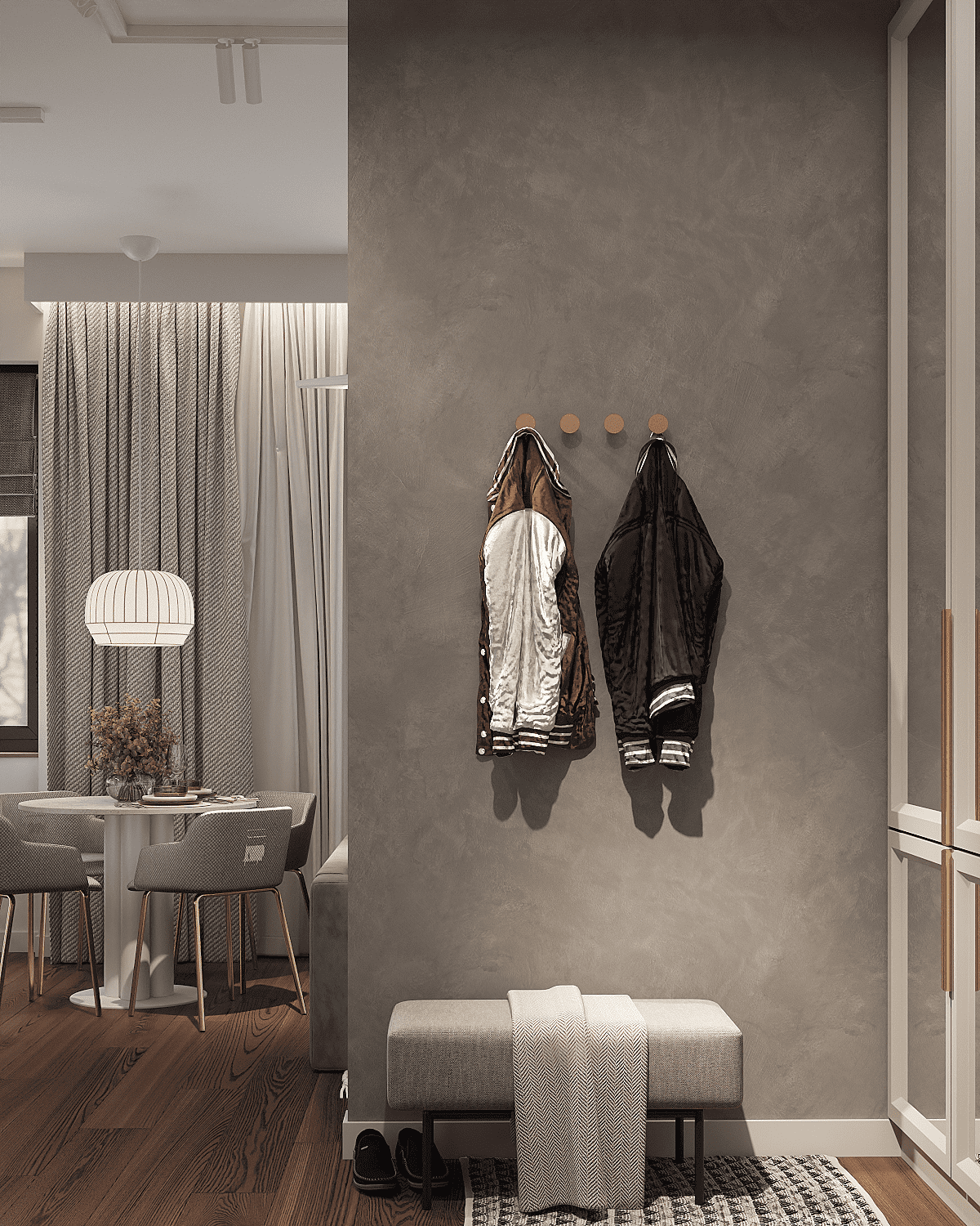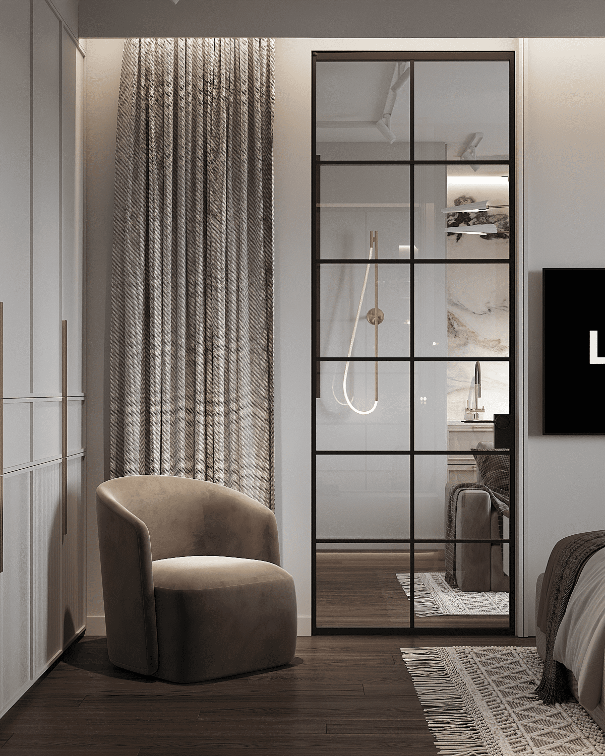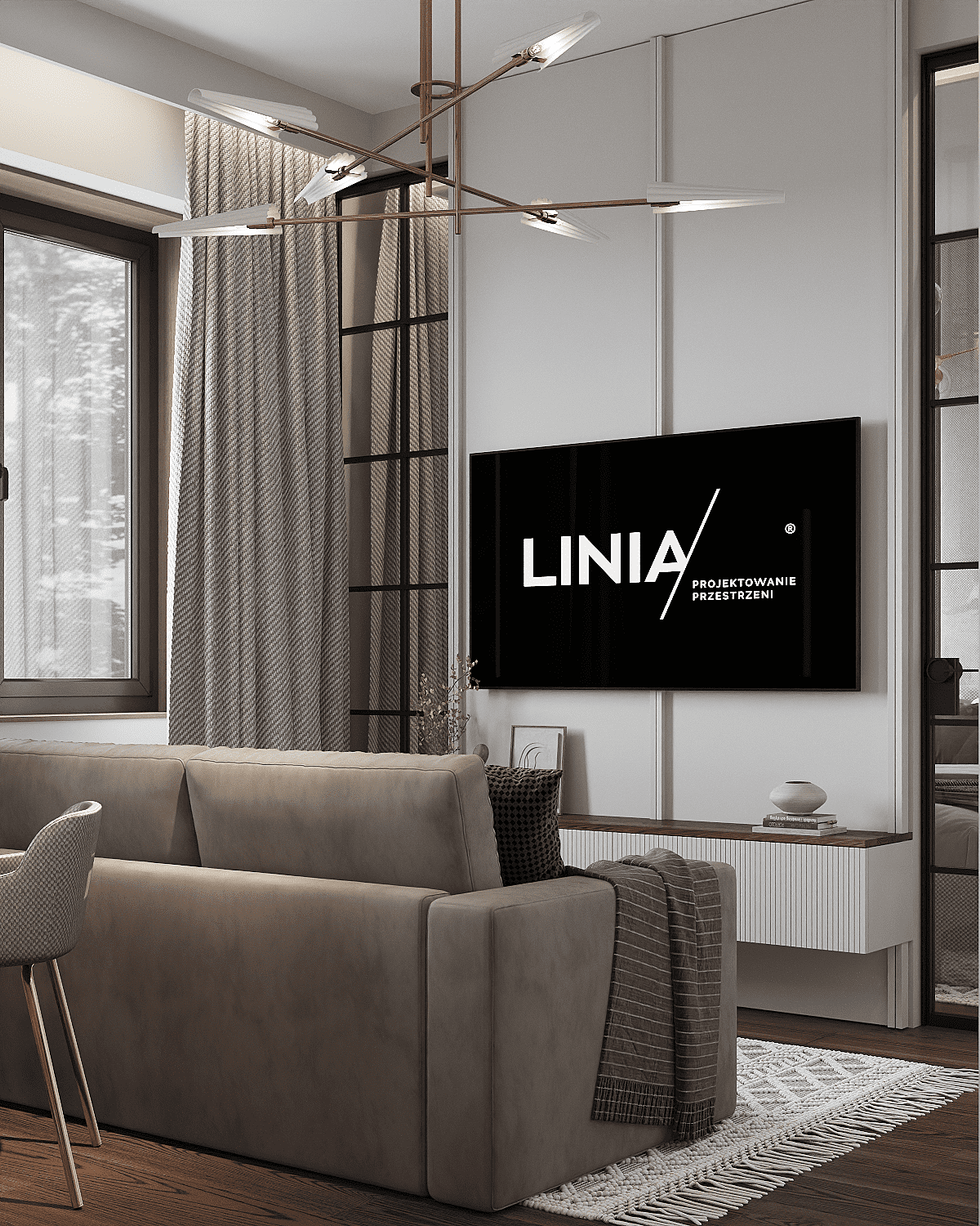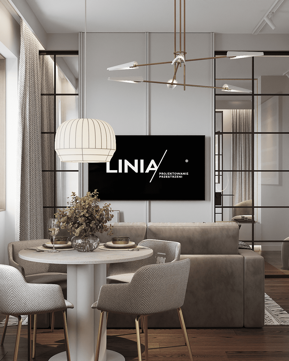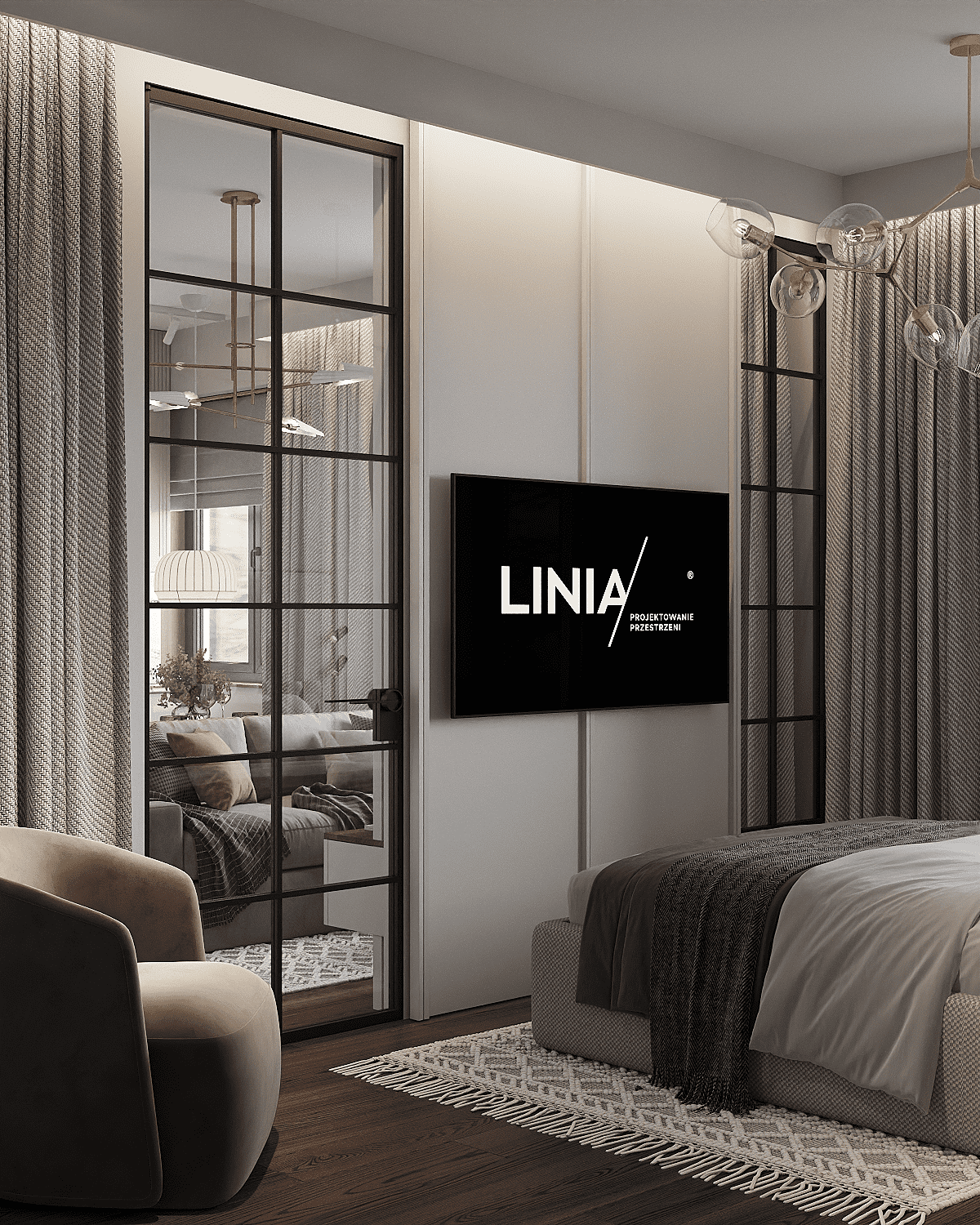 Zastosowaliśmy modyfikację układu funkcjonalnego, która pozwoliła na uzyskanie dwóch odrębnych, a jednocześnie spójnych stref. Kluczowym krokiem było wydzielenie osobnej sypialni przy użyciu nowoczesnego rozwiązania – ścianki z przeszkleniami. Takie podejście pozwoliło na optyczne oddzielenie strefy prywatnej, jednocześnie wpuszczając do niej naturalne światło z otwartego salonu. Ze względu na parterową lokalizację mieszkania, zdecydowaliśmy się na stworzenie mini wiatrołapu przy wejściu. Dzięki odpowiednio zaprojektowanej zabudowie, przestrzeń ta pełni funkcję praktycznego miejsca do przechowywania, co pozwala na utrzymanie porządku w strefie dziennej.