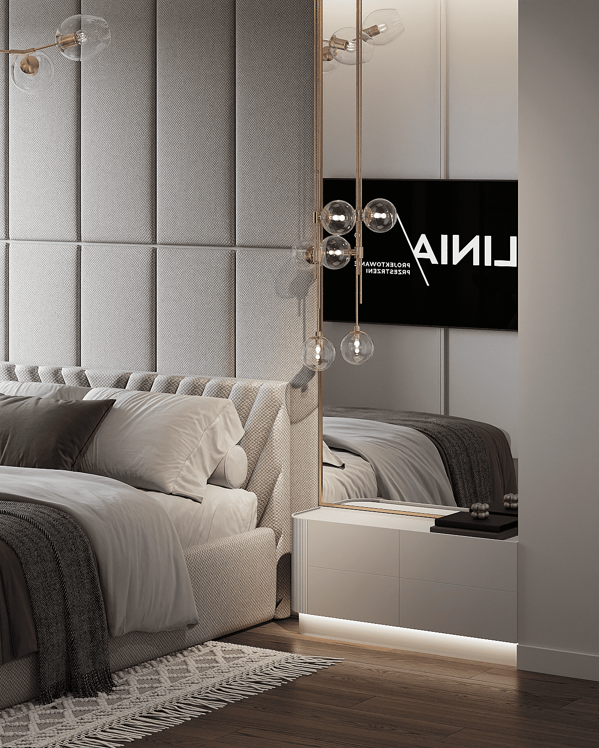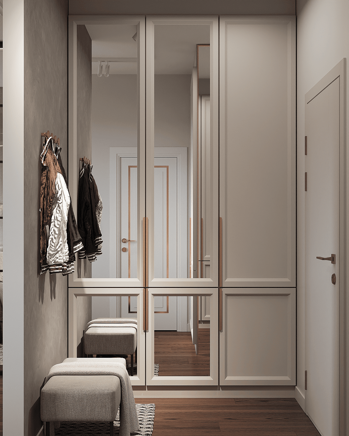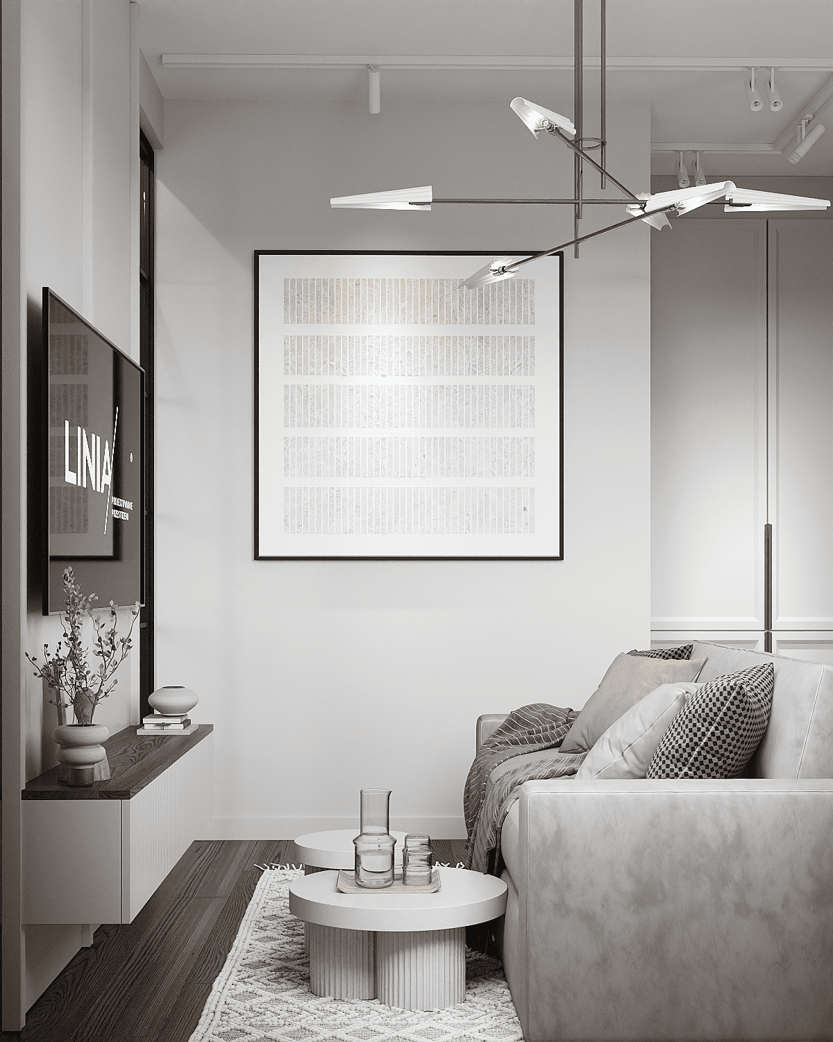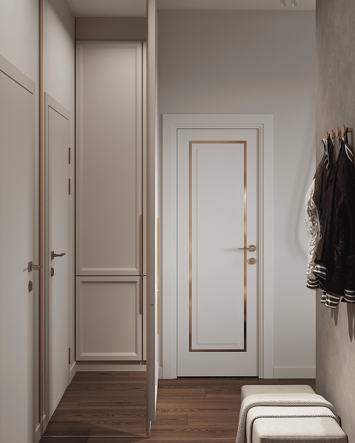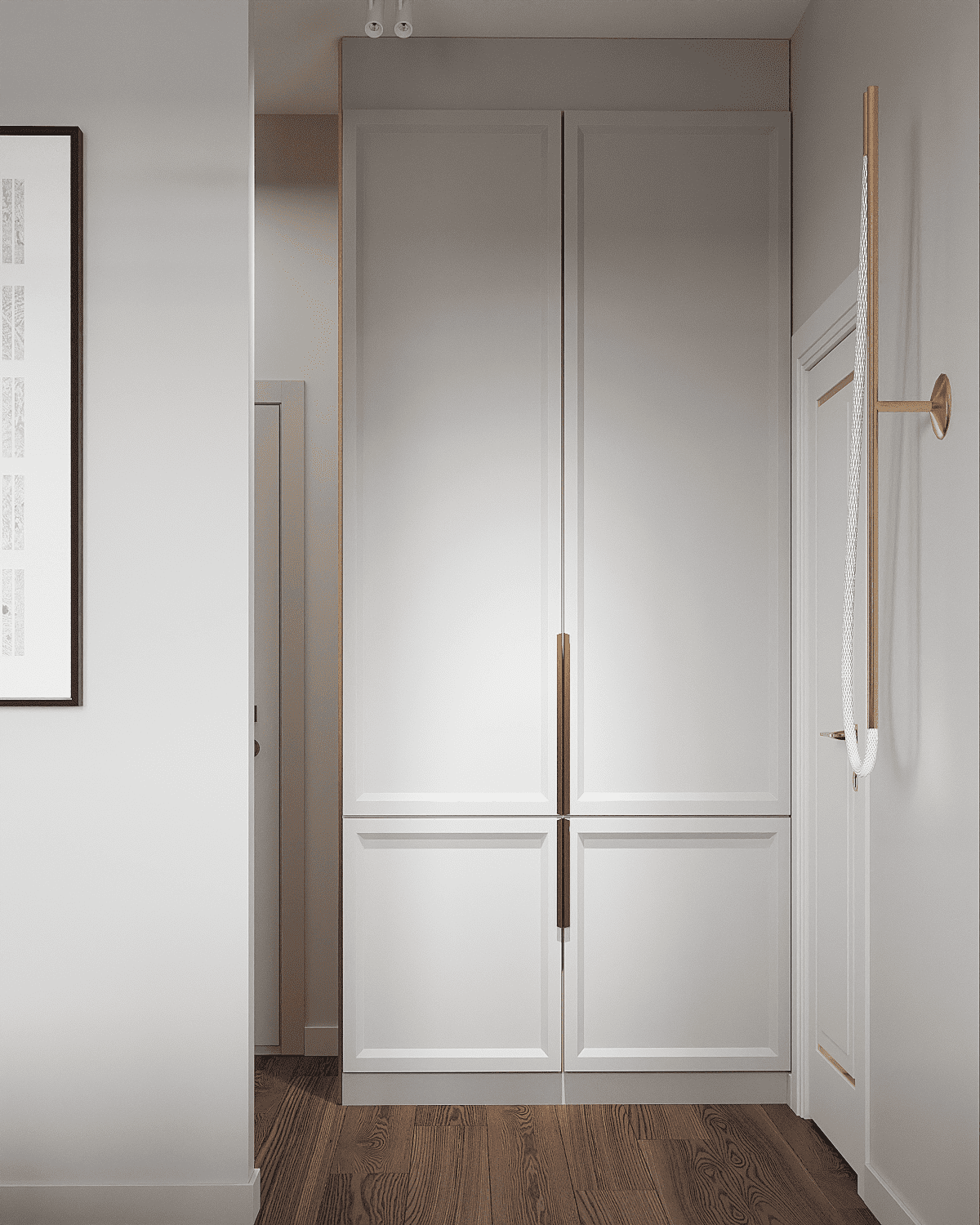 Zastosowaliśmy modyfikację układu funkcjonalnego, która pozwoliła na uzyskanie dwóch odrębnych, a jednocześnie spójnych stref. Kluczowym krokiem było wydzielenie osobnej sypialni przy użyciu nowoczesnego rozwiązania – ścianki z przeszkleniami. Takie podejście pozwoliło na optyczne oddzielenie strefy prywatnej, jednocześnie wpuszczając do niej naturalne światło z otwartego salonu. Ze względu na parterową lokalizację mieszkania, zdecydowaliśmy się na stworzenie mini wiatrołapu przy wejściu. Dzięki odpowiednio zaprojektowanej zabudowie, przestrzeń ta pełni funkcję praktycznego miejsca do przechowywania, co pozwala na utrzymanie porządku w strefie dziennej.