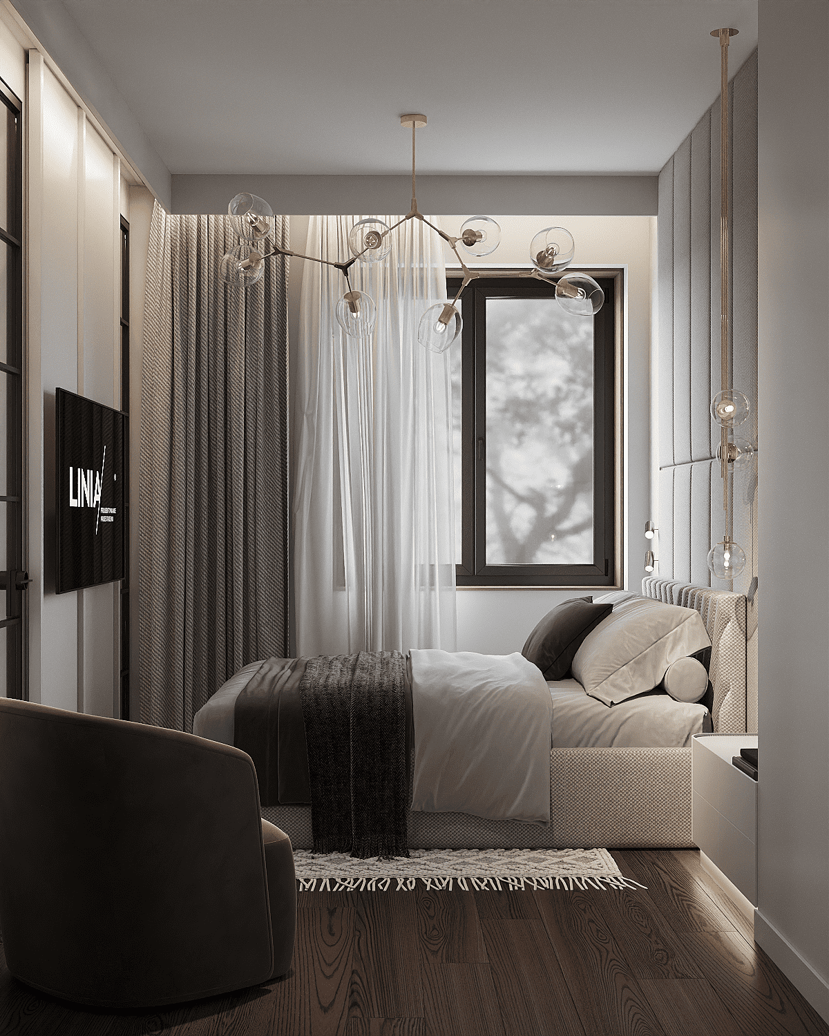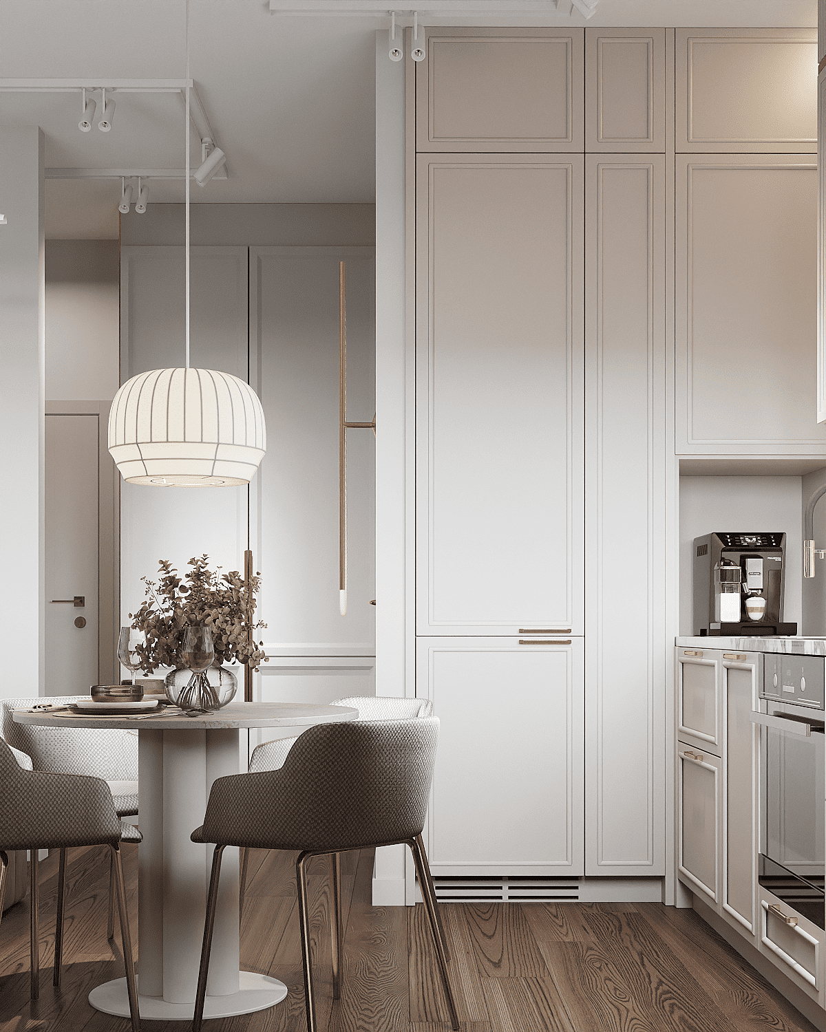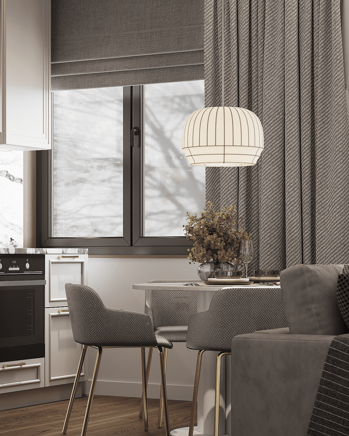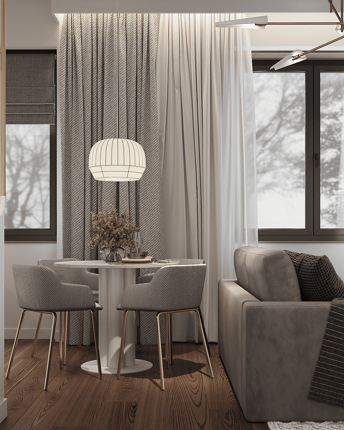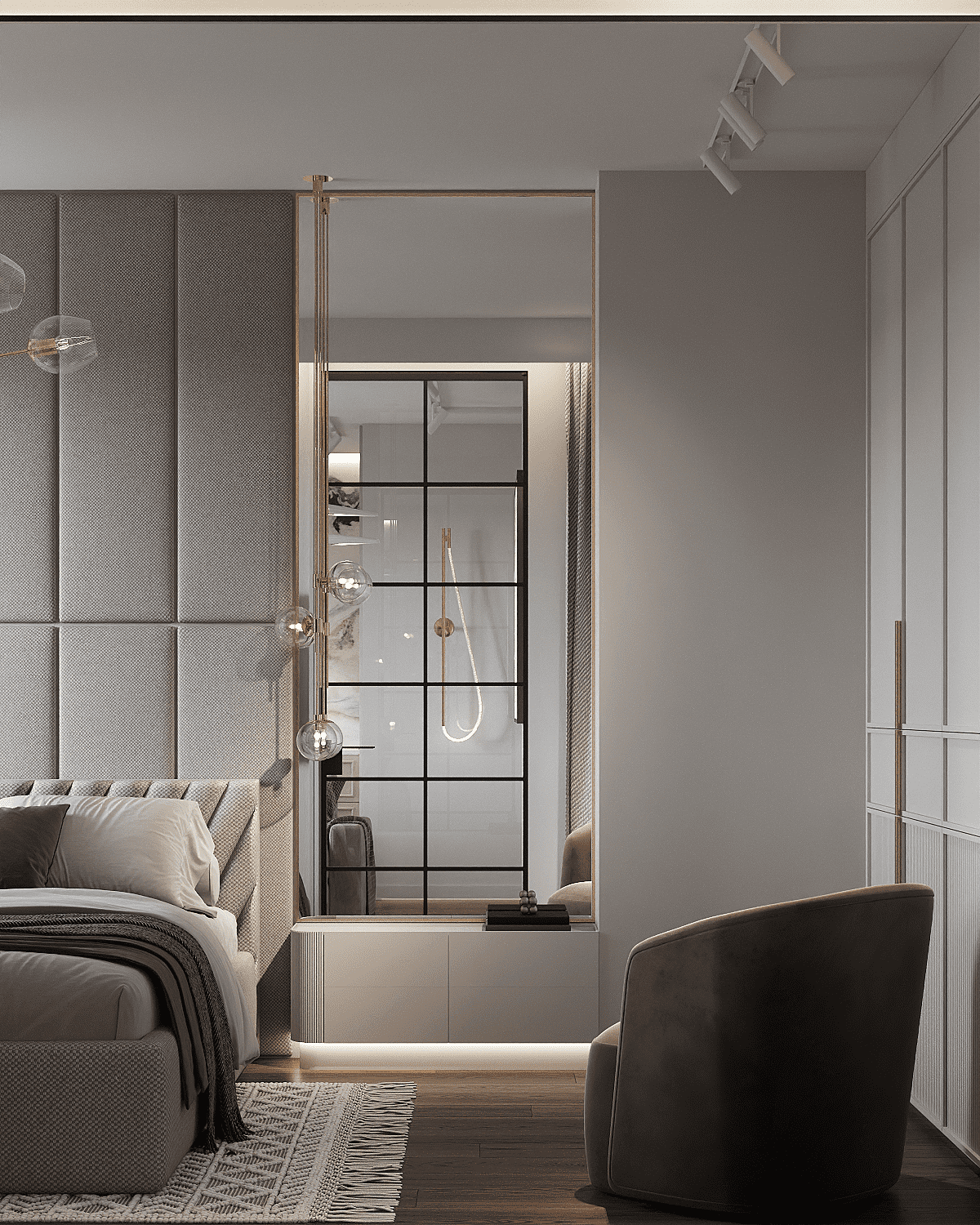Zastosowaliśmy modyfikację układu funkcjonalnego, która pozwoliła na uzyskanie dwóch odrębnych, a jednocześnie spójnych stref. Kluczowym krokiem było wydzielenie osobnej sypialni przy użyciu nowoczesnego rozwiązania – ścianki z przeszkleniami. Takie podejście pozwoliło na optyczne oddzielenie strefy prywatnej, jednocześnie wpuszczając do niej naturalne światło z otwartego salonu. Ze względu na parterową lokalizację mieszkania, zdecydowaliśmy się na stworzenie mini wiatrołapu przy wejściu. Dzięki odpowiednio zaprojektowanej zabudowie, przestrzeń ta pełni funkcję praktycznego miejsca do przechowywania, co pozwala na utrzymanie porządku w strefie dziennej.