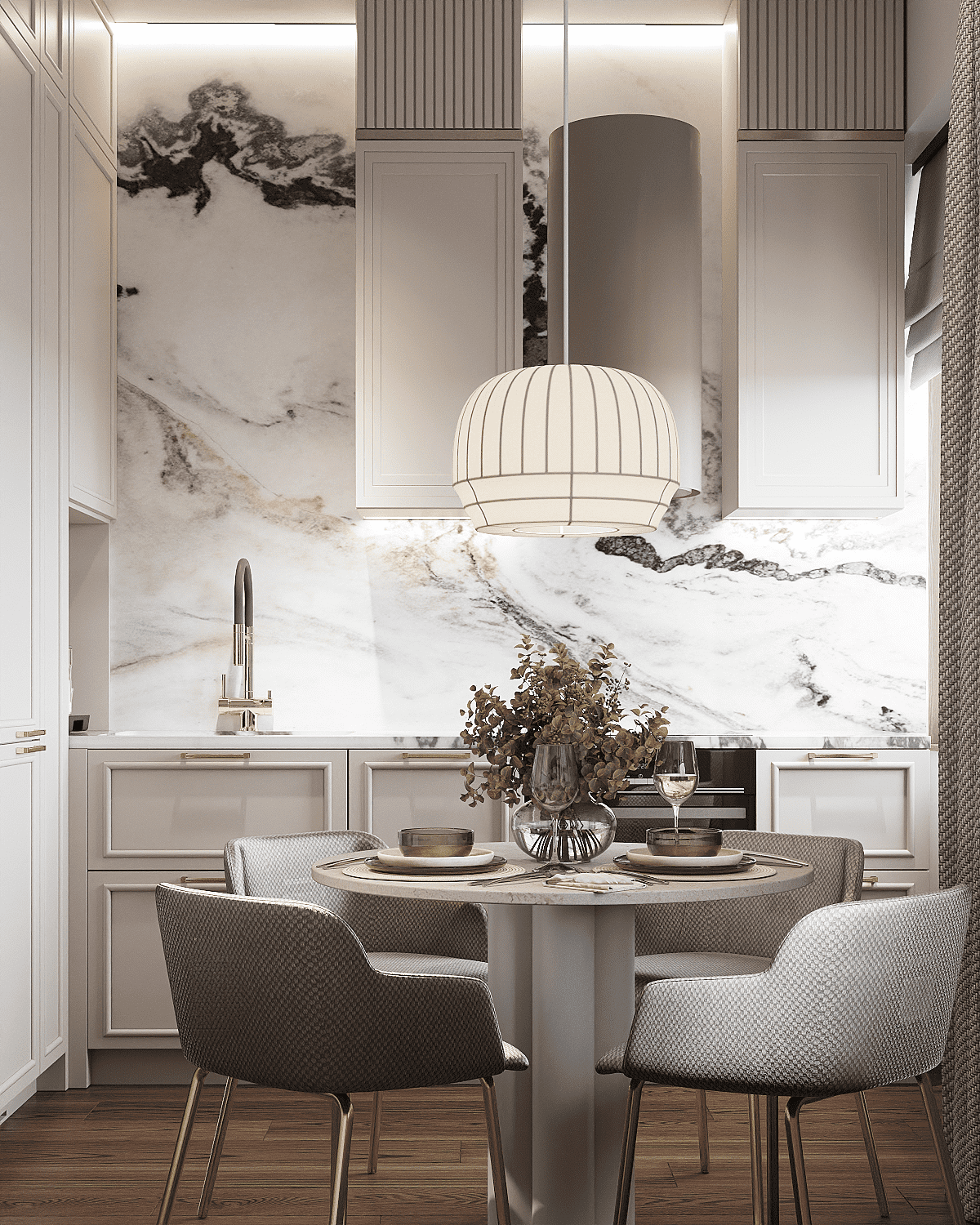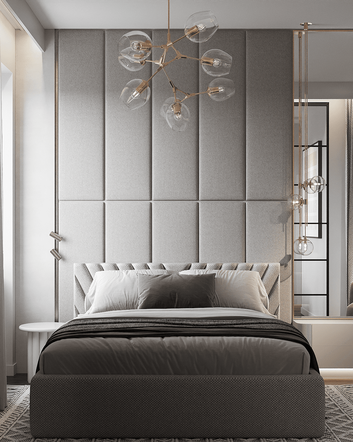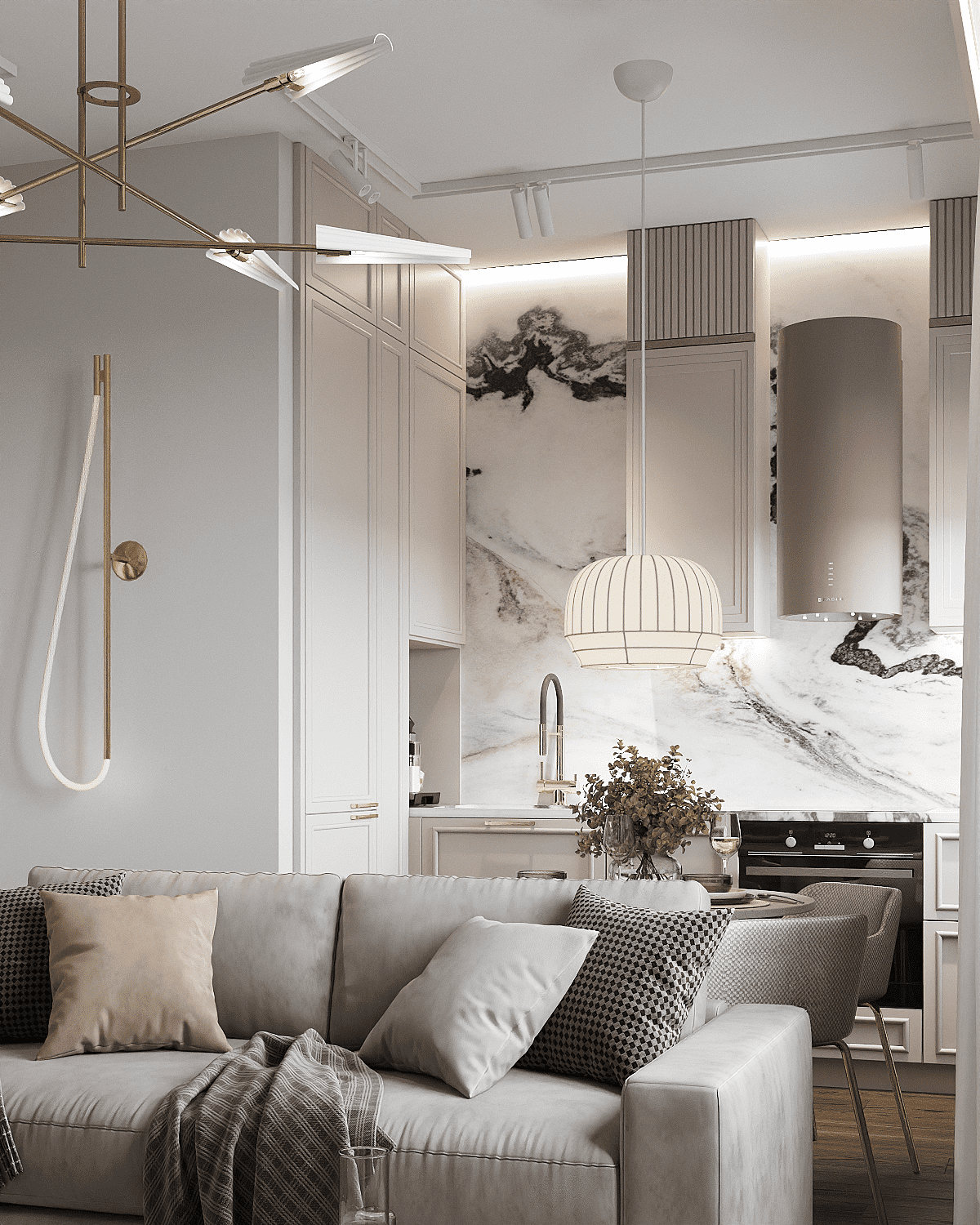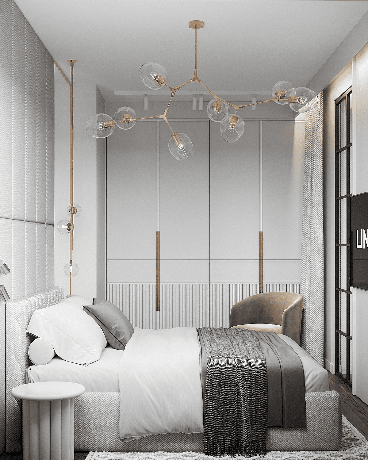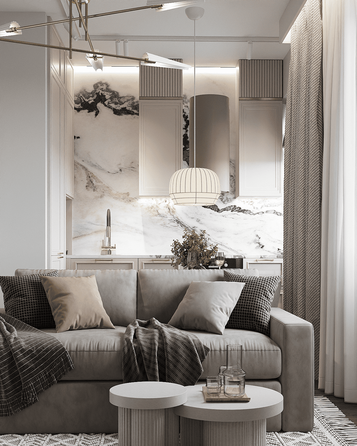 Zastosowaliśmy modyfikację układu funkcjonalnego, która pozwoliła na uzyskanie dwóch odrębnych, a jednocześnie spójnych stref. Kluczowym krokiem było wydzielenie osobnej sypialni przy użyciu nowoczesnego rozwiązania – ścianki z przeszkleniami. Takie podejście pozwoliło na optyczne oddzielenie strefy prywatnej, jednocześnie wpuszczając do niej naturalne światło z otwartego salonu. Ze względu na parterową lokalizację mieszkania, zdecydowaliśmy się na stworzenie mini wiatrołapu przy wejściu. Dzięki odpowiednio zaprojektowanej zabudowie, przestrzeń ta pełni funkcję praktycznego miejsca do przechowywania, co pozwala na utrzymanie porządku w strefie dziennej.